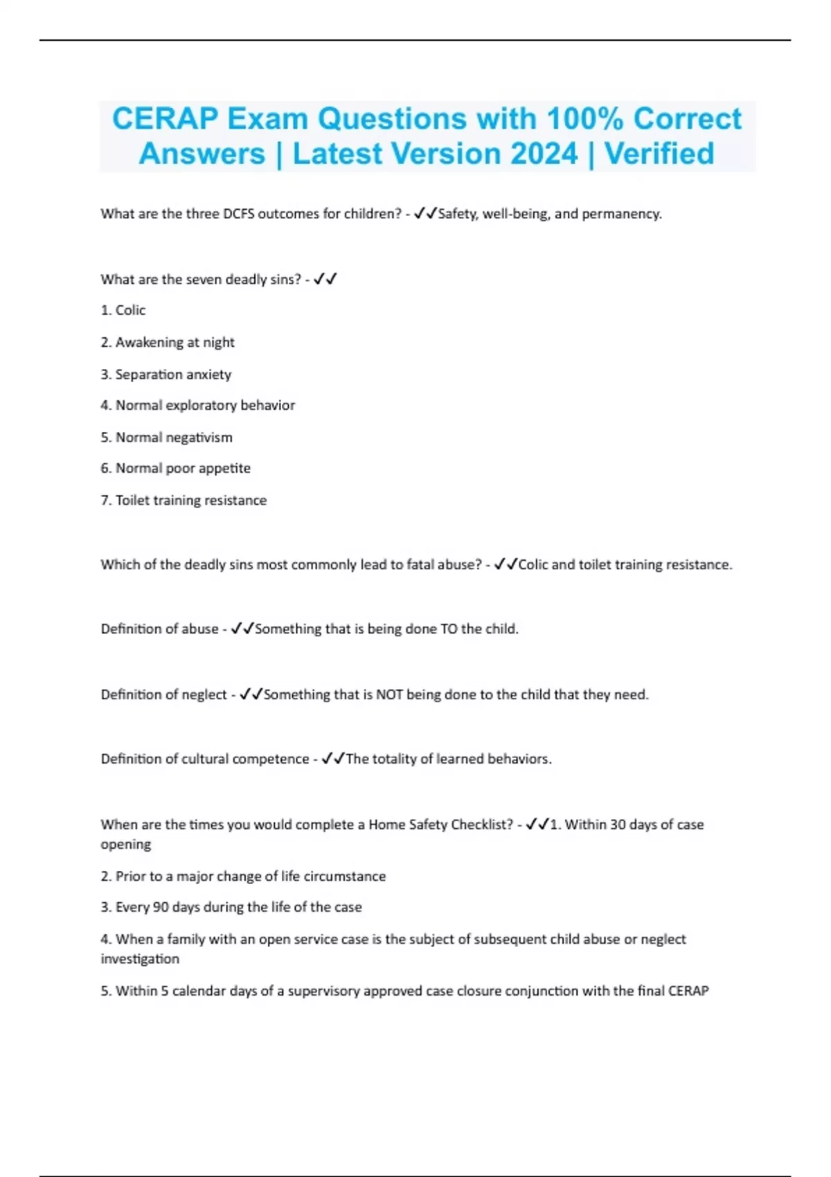 What are the three DCFS outcomes for children? - Safety, well-being, and permanency. What are the seven deadly sins? - 1. Colic 2. Awakening at night 3. Separation anxiety 4. Normal exploratory behavior 5. Normal negativism 6. Normal poor appetite 7. Toilet training resistance Which of the deadly sins most commonly lead to fatal abuse? - Colic and toilet training resistance. Definition of abuse - Something that is being done TO the child. Definition of neglect - Something that is NOT being done to the child that they need