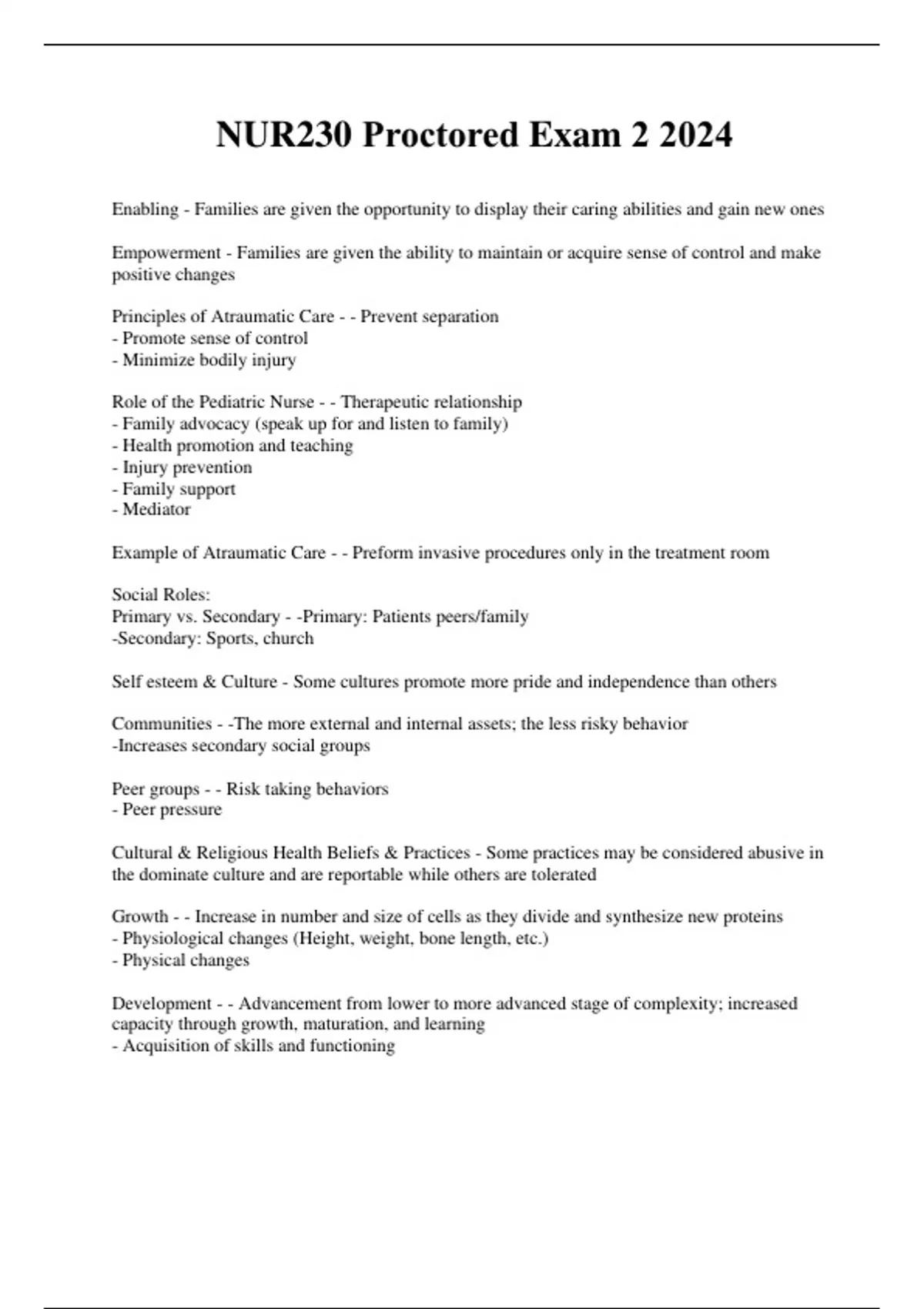 Enabling - Families are given the opportunity to display their caring abilities and gain new ones Empowerment - Families are given the ability to maintain or acquire sense of control and make positive changes Principles of Atraumatic Care - - Prevent separation - Promote sense of control - Minimize bodily injury Role of the Pediatric Nurse - - Therapeutic relationship - Family advocacy (speak up for and listen to family) - Health promotion and teaching - Injury prevention - Family support - Mediator Example of Atraumatic Care - - Preform invasive procedures only in the treatment room Social Roles: Primary vs. Secondary - -Primary: Patients peers/family -Secondary: Sports, church Self esteem & Culture - Some cultures promote more pride and independence than others Communities - -The more external and internal assets; the less risky behavior -Increases secondary social groups Peer groups - - Risk taking behaviors - Peer pressure Cultural & Religious Health Beliefs & Practices - Some practices may be considered abusive in the dominate culture and are reportable while others are tolerated Growth - - Increase in number and size of cells as they divide and synthesize new proteins - Physiological changes (Height, weight, bone length, etc.) - Physical changes Development - - Advancement from lower to more advanced stage of complexity; increased capacity through growth, maturation, and learning - Acquisition of skills and functioning