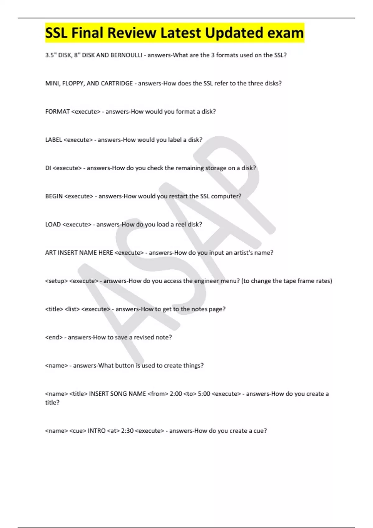 SSL Final Review Latest Updated exam 3.5" DISK, 8" DISK AND BERNOULLI - answers-What are the 3 formats used on the SSL? MINI, FLOPPY, AND CARTRIDGE - answers-How does the SSL refer to the three disks? FORMAT <execute> - answers-How would you format a disk?