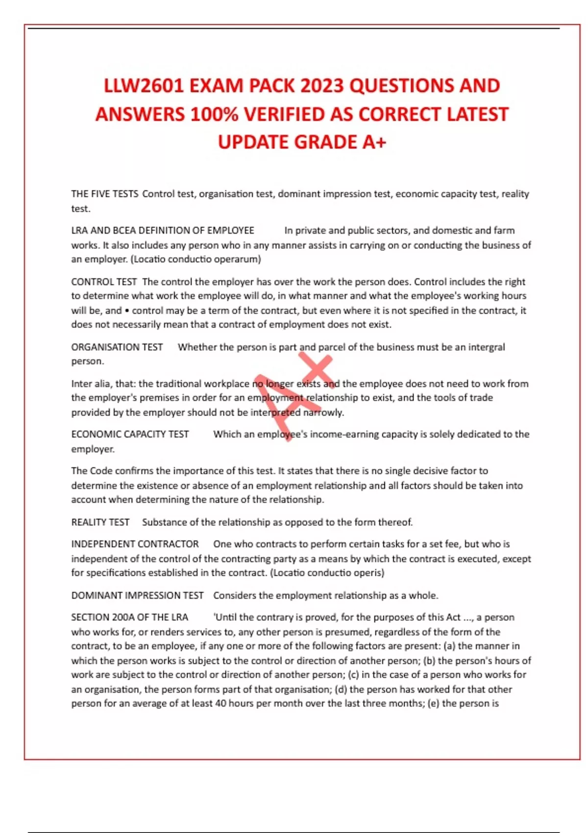 LLW2601 EXAM PACK 2023 QUESTIONS AND ANSWERS 100% VERIFIED AS CORRECT LATEST UPDATE GRADE A+ THE FIVE TESTS Control test, organisation test, dominant impression test, economic capacity test, reality test. LRA AND BCEA DEFINITION OF EMPLOYEE In private and public sectors, and domestic and farm works. It also includes any person who in any manner assists in carrying on or conducting the business of an employer. (Locatio conductio operarum) CONTROL TEST The control the employer has over the work the person does. Control includes the right to determine what work the employee will do, in what manner and what the employee's working hours will be, and • control may be a term of the contract, but even where it is not specified in the contract, it does not necessarily mean that a contract of employment does not exist. ORGANISATION TEST Whether the person is part and parcel of the business must be an intergral person. Inter alia, that: the traditional workplace no longer exists and the employee does not need to work from the employer's premises in order for an employment relationship to exist, and the tools of trade provided by the employer should not be interpreted narrowly. ECONOMIC CAPACITY TEST Which an employee's income-earning capacity is solely dedicated to the employer. The Code confirms the importance of this test. It states that there is no single decisive factor to determine the existence or absence of an employment relationship and all factors should be taken into account when determining the nature of the relationship. REALITY TEST Substance of the relationship as opposed to the form thereof. INDEPENDENT CONTRACTOR One who contracts to perform certain tasks for a set fee, but who is independent of the control of the contracting party as a means by which the contract is executed, except for specifications established in the contract. (Locatio conductio operis) DOMINANT IMPRESSION TEST Considers the employment relationship as a whole. SECTION 200A OF THE LRA 'Until the contrary is proved, for the purposes of this Act ..., a person who works for, or renders services to, any other person is presumed, regardless of the form of the contract, to be an employee, if any one or more of the following factors are present: (a) the manner in which the person works is subject to the control or direction of another person; (b) the person's hours of work are subject to the control or direction of another person