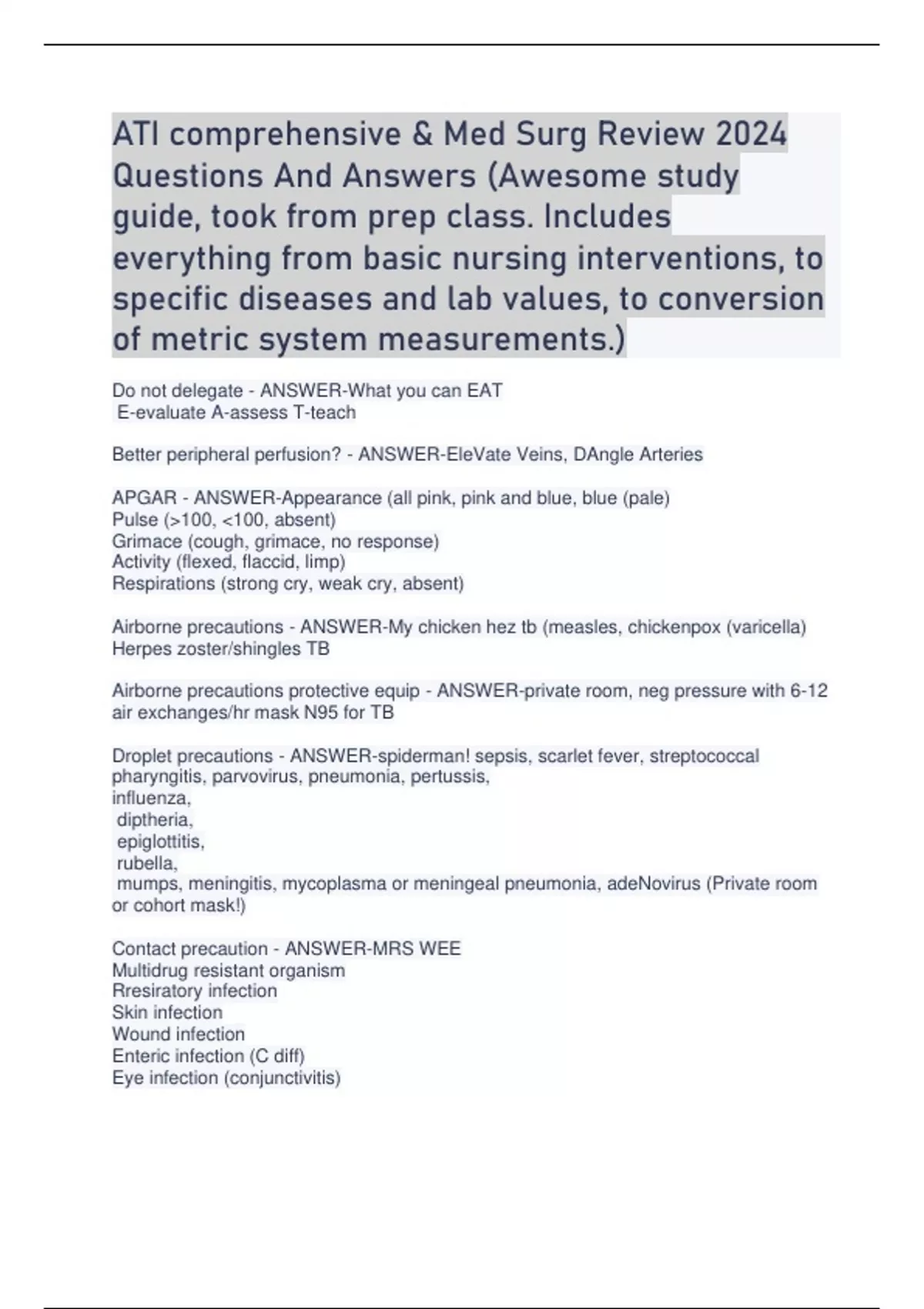 ATI comprehensive & Med Surg Review 2024 Questions And Answers (Awesome study guide, took from prep class. Includes everything from basic nursing interventions, to specific diseases and lab values, to conversion of metric system measurements.)