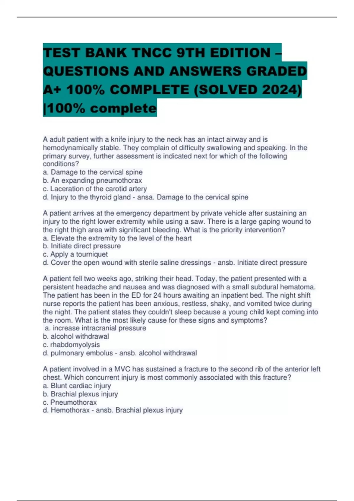 TEST BANK TNCC 9TH EDITION – QUESTIONS AND ANSWERS GRADED A+ 100% COMPLETE (SOLVED 2024) |100% complet