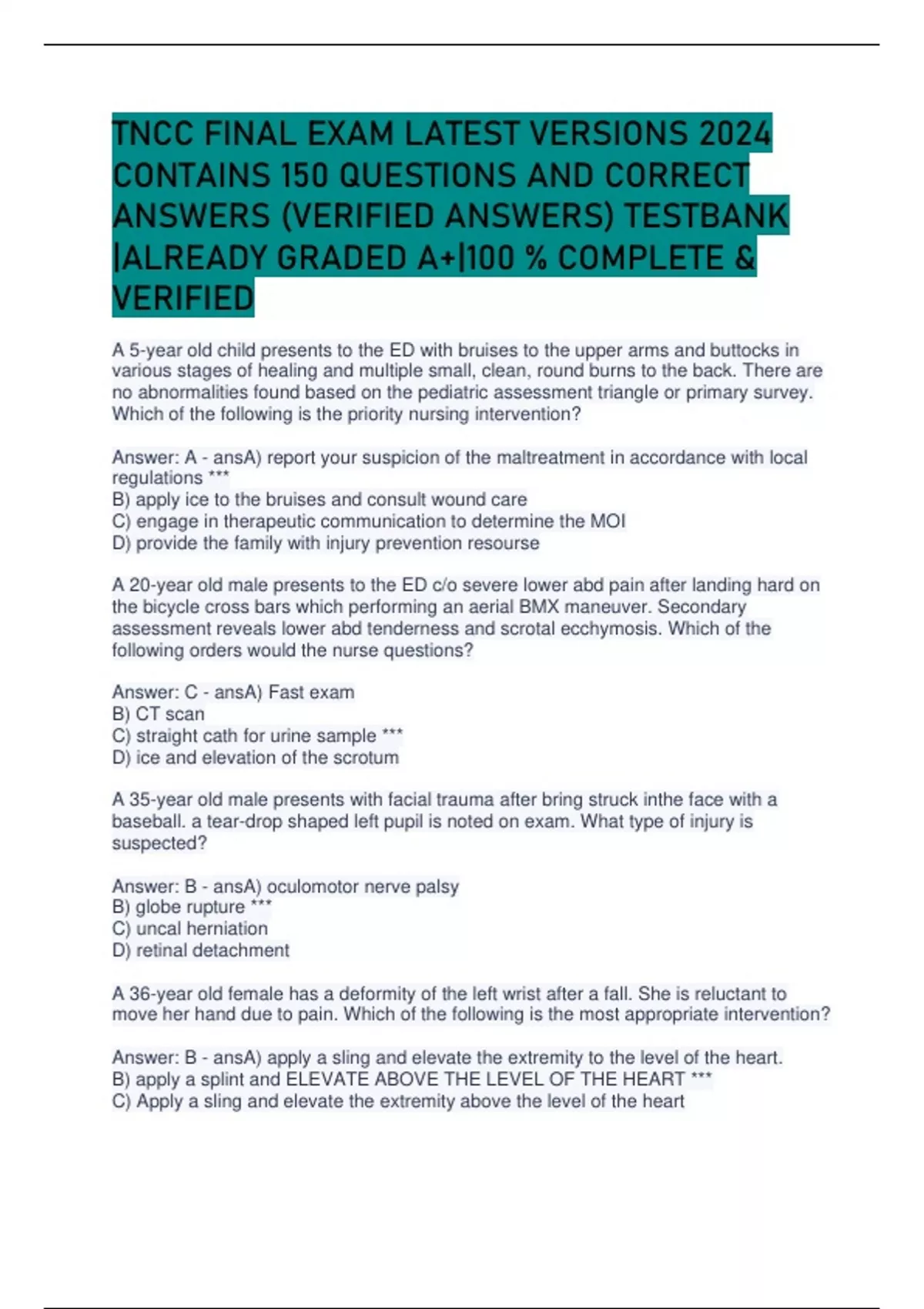 TNCC FINAL EXAM LATEST VERSIONS 2024 CONTAINS 150 QUESTIONS AND CORRECT ANSWERS (VERIFIED ANSWERS) TESTBANK |ALREADY GRADED A+|100 % COMPLETE & VERIFIED