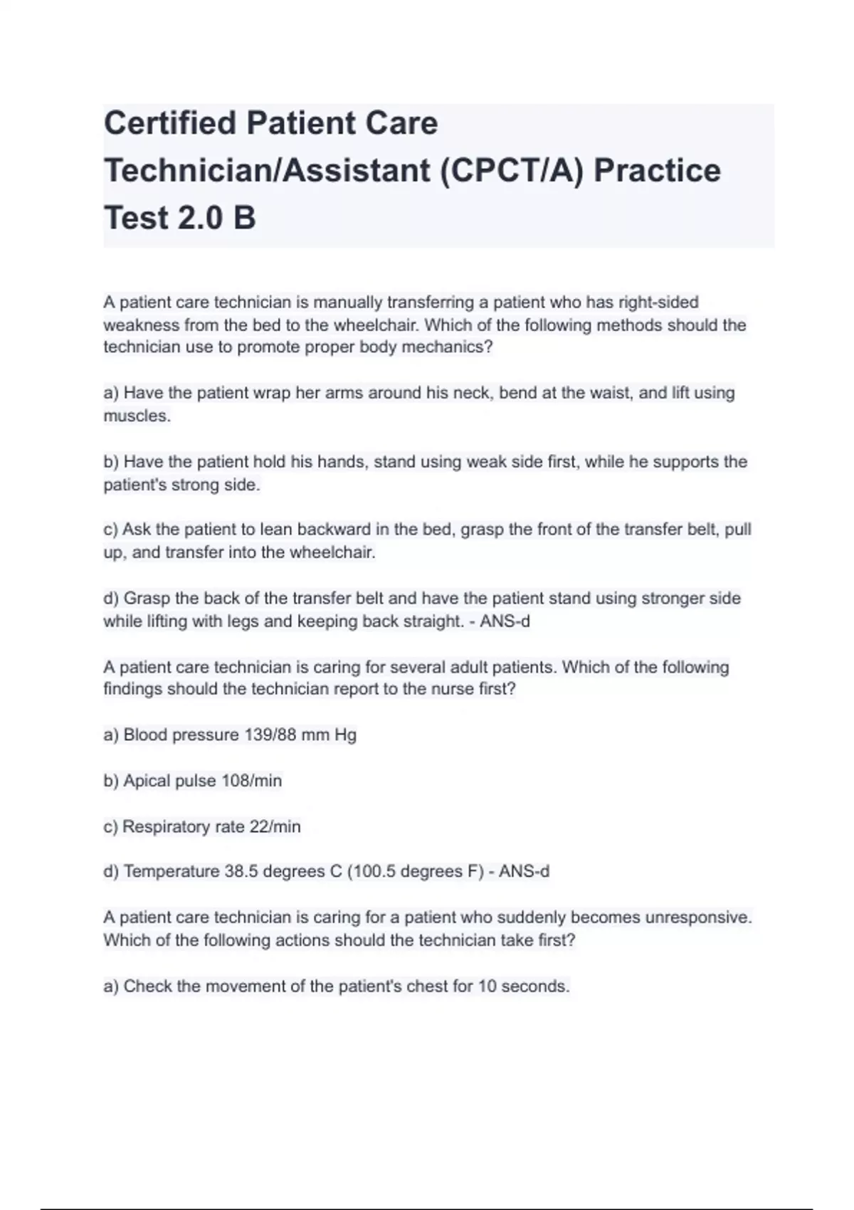 Certified Patient Care Technician_Assistant (CPCT_A) Practice Test 2.0 B