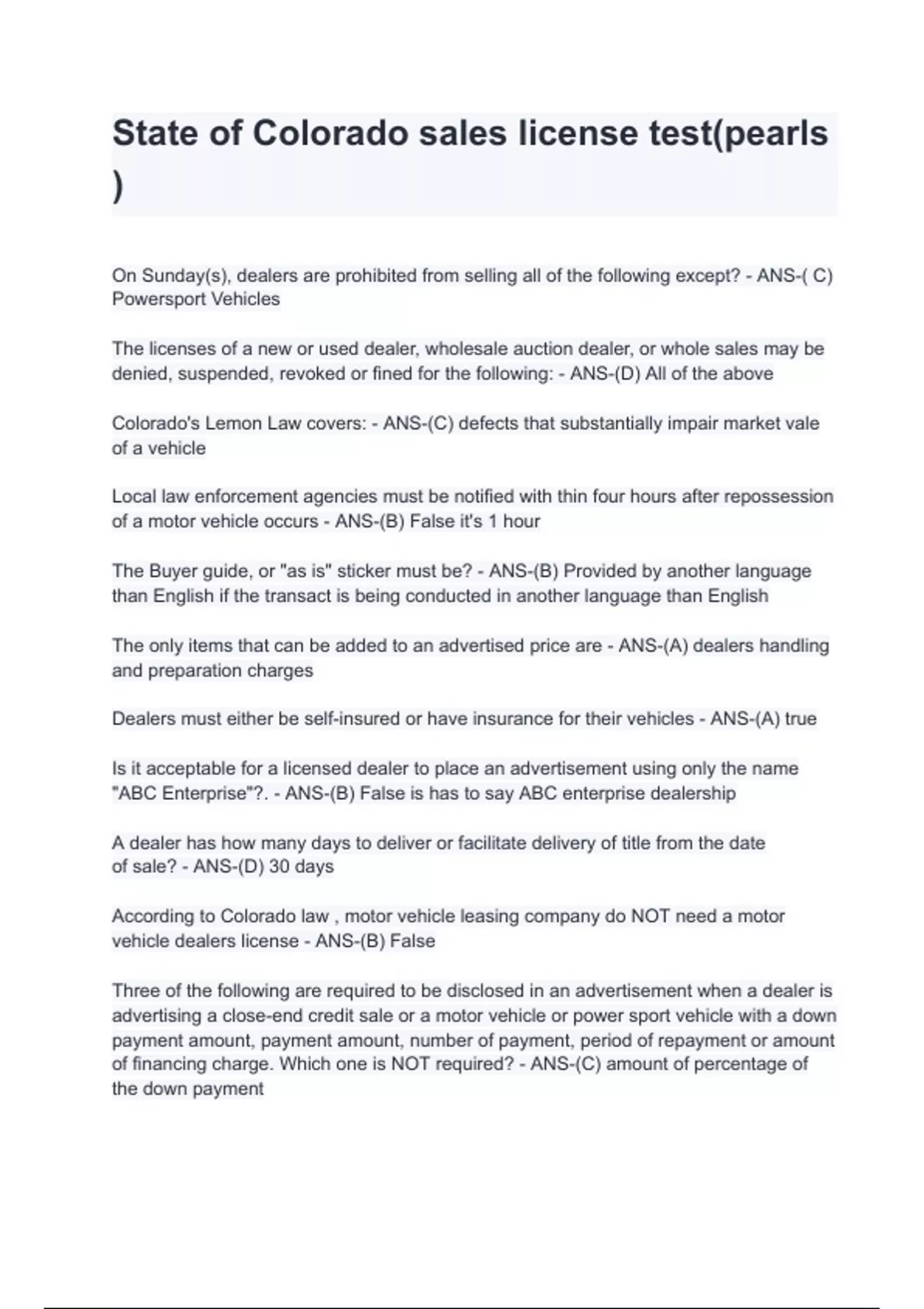 State of Colorado sales license test(pearls ).
