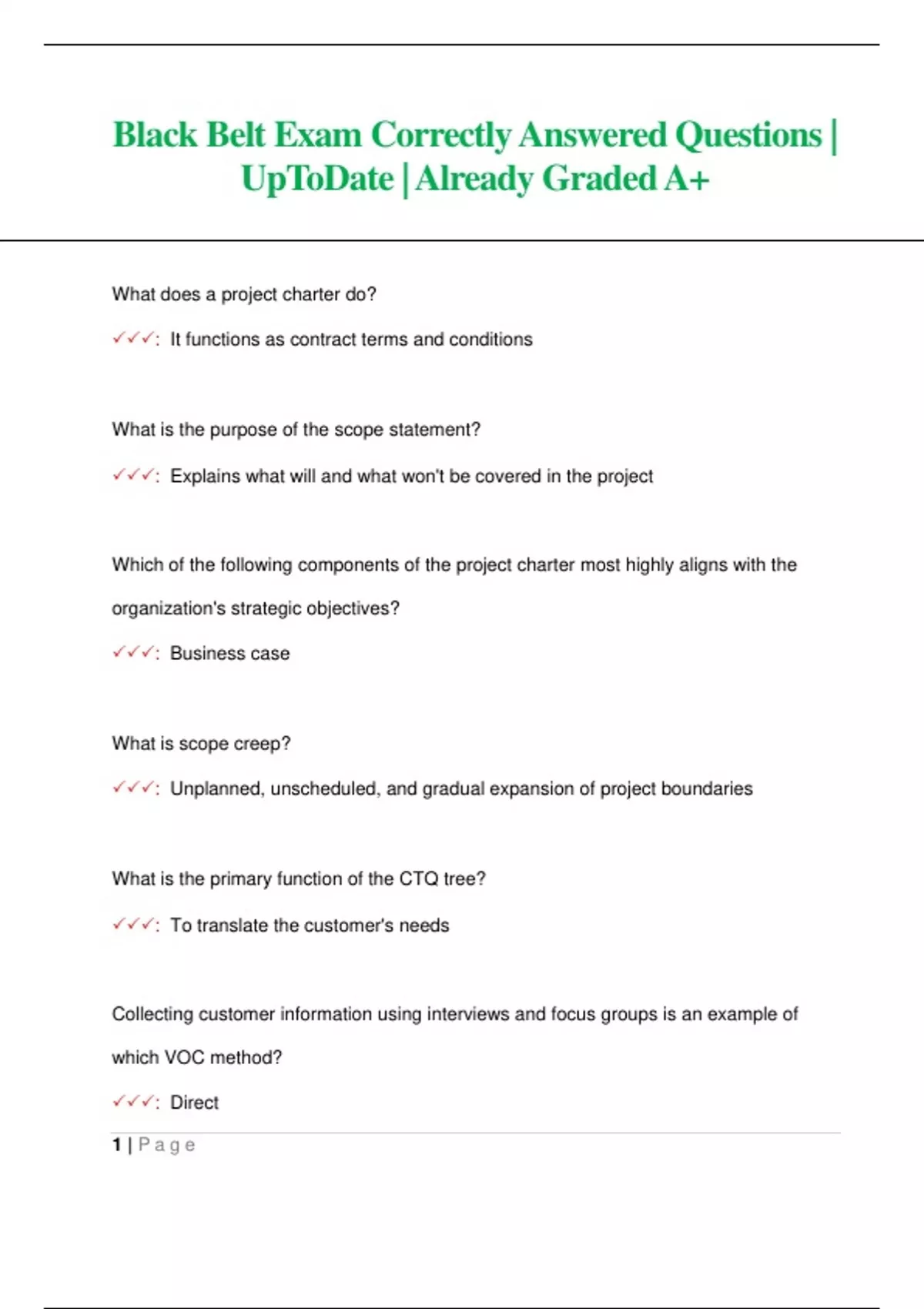 What does a project charter do? : It functions as contract terms and conditions What is the purpose of the scope statement? : Explains what will and what won't be covered in the project Which of the following components of the project charter most highly aligns with the organization's strategic objectives? : Business case What is scope creep? : Unplanned, unscheduled, and gradual expansion of project boundaries What is the primary function of the CTQ tree? : To translate the customer's needs Collecting customer information using interviews and focus groups is an example of which VOC method? : Direct 2 | P a g e Which of the following is an outcome of using the Kano model? : Improved marketing efforts Better understanding of customer requirements Prioritized development efforts In which do the six elements that contribute to the variation in a process (the 6M's) influence variation? (Choose the most correct option.) : Any process Which of the following is true regarding the customer needs and requirements tollgate? : - You should have an approved charter at this point - You will need to describe the customer group that is being impacted by the problem identified in the charter - You should be able to describe what need the product or service is not meeting Process owners generally see processes from three different perspectives. Which view should the project team always map? : As-is vie