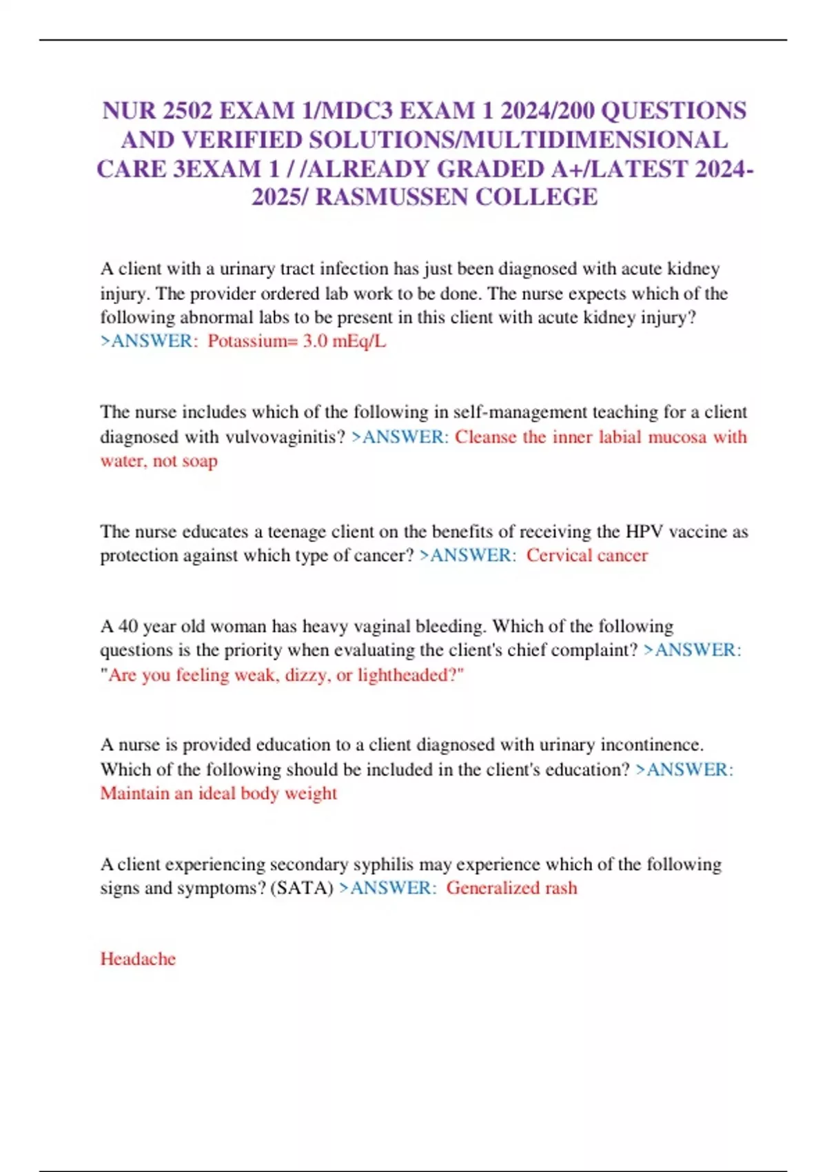 NUR 2502 EXAM 1/MDC3 EXAM 1 2024/200 QUESTIONS AND VERIFIED SOLUTIONS/MULTIDIMENSIONAL CARE 3EXAM 1 / /ALREADY GRADED A+/LATEST / RASMUSSEN COLLEGE