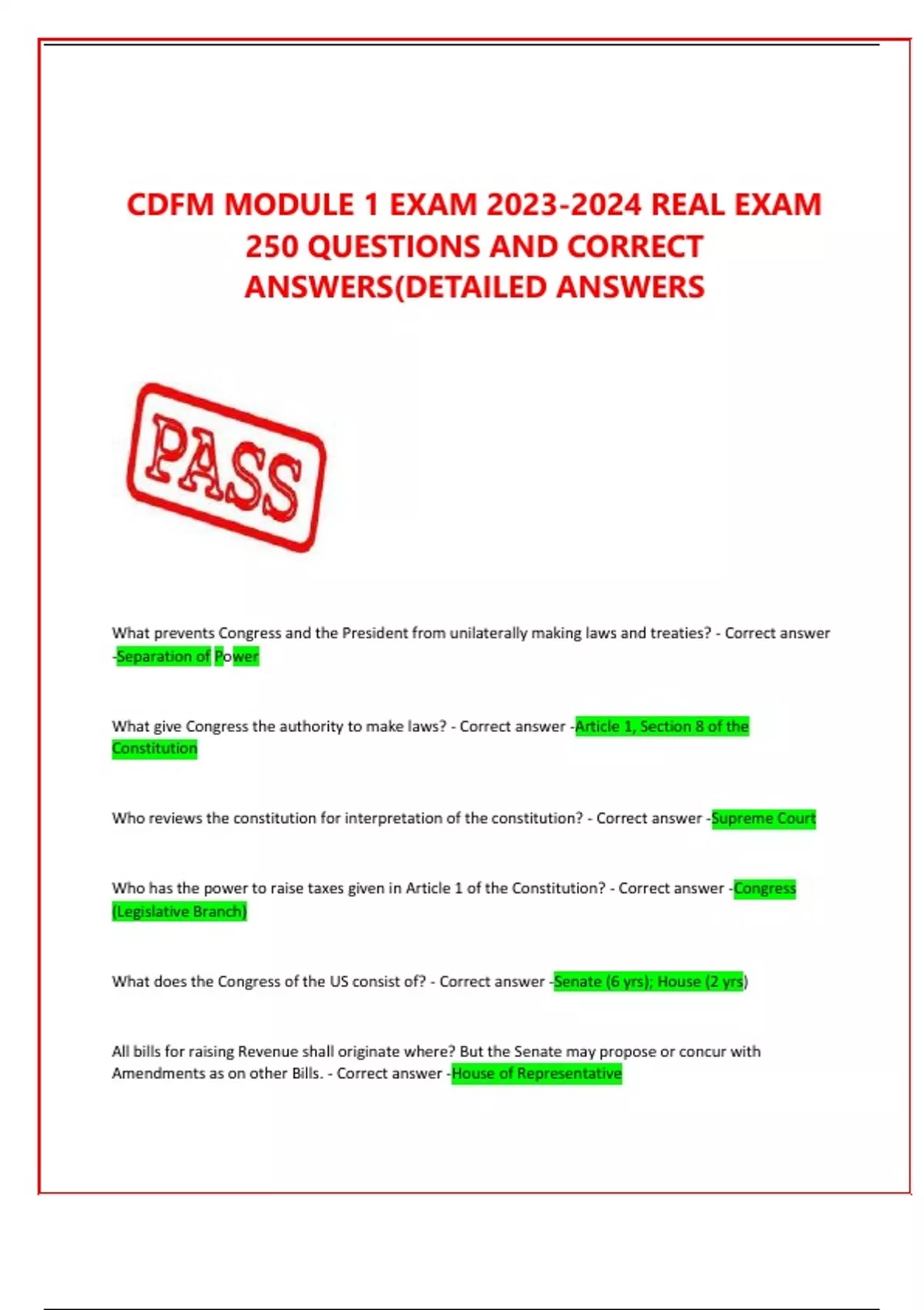 What prevents Congress and the President from unilaterally making laws and treaties? - Correct answer -Separation of Power What give Congress the authority to make laws? - Correct answer -Article 1, Section 8 of the Constitution Who reviews the constitution for interpretation of the constitution? - Correct answer -Supreme Court Who has the power to raise taxes given in Article 1 of the Constitution? - Correct answer -Congress (Legislative Branch) What does the Congress of the US consist of? - Correct answer -Senate (6 yrs); House (2 yrs) All bills for raising Revenue shall originate where? But the Senate may propose or concur with Amendments as on other Bills. - Correct answer -House of Representative