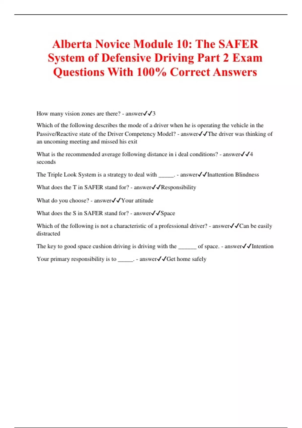 Alberta Novice Module 10: The SAFER System of Defensive Driving Part 2 Exam Questions With 100% Correct Answers How many vision zones are there? - answer3 Which of the following describes the mode of a driver when he is operating the vehicle in the Passive/Reactive state of the Driver Competency Model? - answerThe driver was thinking of an uncoming meeting and missed his exit What is the recommended average following distance in i deal conditions? - answer4 seconds The Triple Look System is a stra
