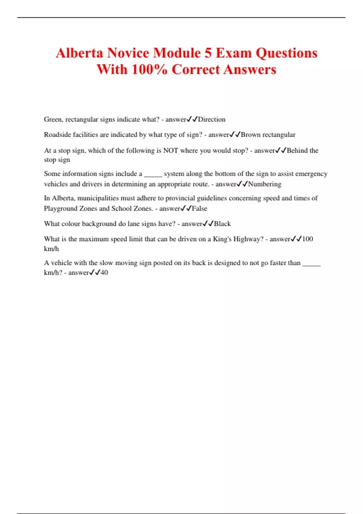 Alberta Novice Module 5 Exam Questions With 100% Correct Answers Green, rectangular signs indicate what? - answerDirection Roadside facilities are indicated by what type of sign? - answerBrown rectangular At a stop sign, which of the following is NOT where you would stop? - answerBehind the stop sign Some information signs include a _____ system along the bottom of the sign to assist emergency vehicles and drivers in determining an appropriate route. -