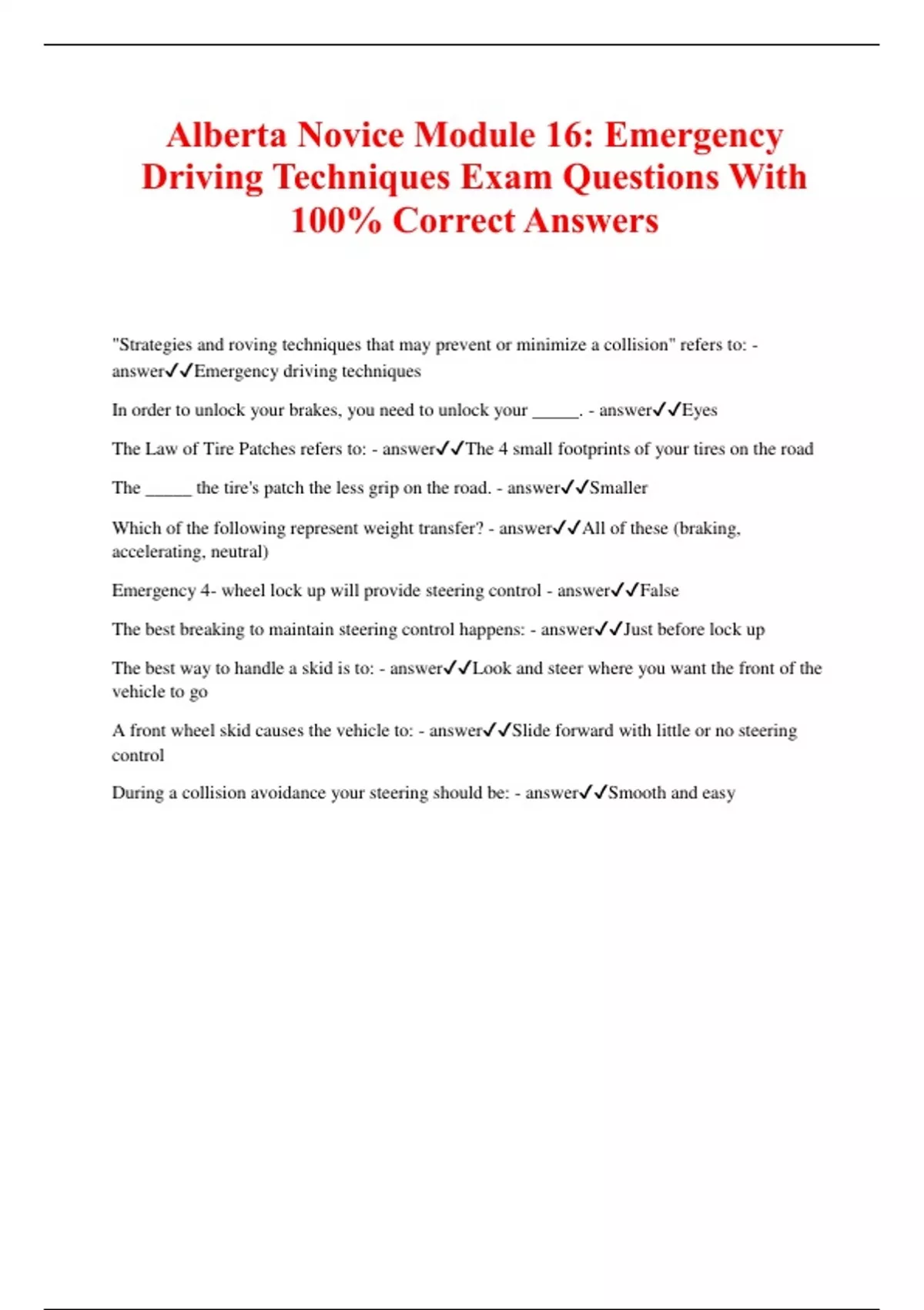 Alberta Novice Module 16: Emergency Driving Techniques Exam Questions With 100% Correct Answers "Strategies and roving techniques that may prevent or minimize a collision" refers to: - answerEmergency driving techniques In order to unlock your brakes, you need to unlock your _____. - answerEyes The Law of Tire Patches refers to: - answerThe 4 small footprints of your tires on the road The _____ the tire's patch the less grip on the road. - answerSmaller