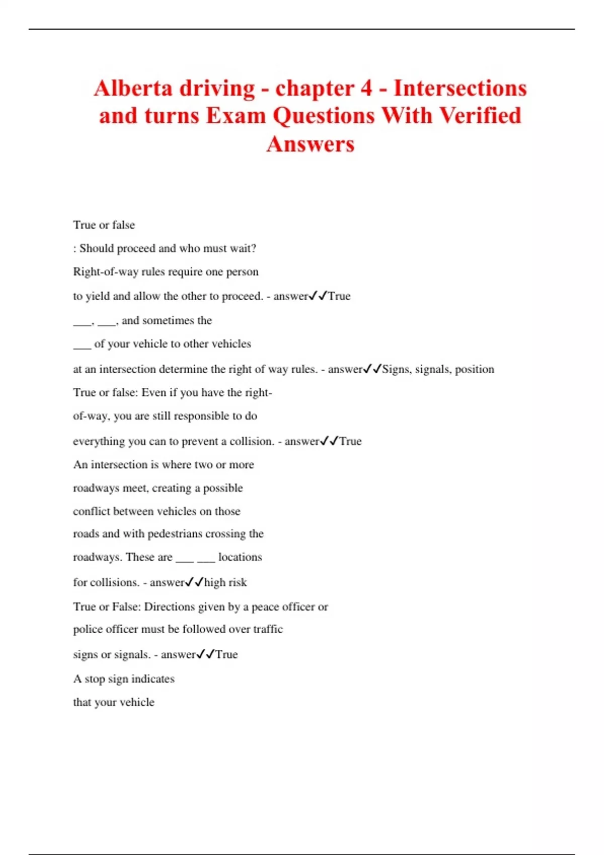 Alberta driving - chapter 4 - Intersections and turns Exam Questions With Verified Answers True or false : Should proceed and who must wait? Right-of-way rules require one person to yield and allow the other to proceed. - answerTrue ___, ___, and sometimes the ___ of your vehicle to other vehicles at an intersection determine the right of way rules. - answerSigns, signals, position True or false: Even if you have the right- of-way, you are still responsible to do everything you can to prevent a collision. - answerTrue An intersection is where two or more roadways meet, creating a possible conflict between vehicles on those roads and with pedestrians crossing the roadways. These are ___ ___ locations for collisions. - answerhigh risk True or False: Directions given by a peace officer or police officer must be followed over traffic signs or signals. - answerTrue A stop sign indicates that your vehicle must come to a ___ ___. After stopping, check the intersection carefully for pedestrians and other traffic. When safe, you may proceed. - answercomplete stop True or false: Where a stop line has been marked, bring your vehicle to a complete stop before the stop line. Before moving forward, give pedestrians and traffic the right-of-way. - answerTrue Stop ___ the stop line at a marked crosswalk. - answerBefore Where there is no stop line at a crosswalk, stop ___ the marked crosswalk. - answerBefore If there is no stop line or marked crosswalk at the intersection, you must stop within ___ m of the intersecting roadway. - answer3 Intersections where stop signs are located at all corners are often referred to as "courtesy corners." Vehicles approaching from each direction are required to ___. - answerStop At four way stops. Courtesy is to allow the vehicle that arrived ___ to proceed first. If two vehicles arrive at the same