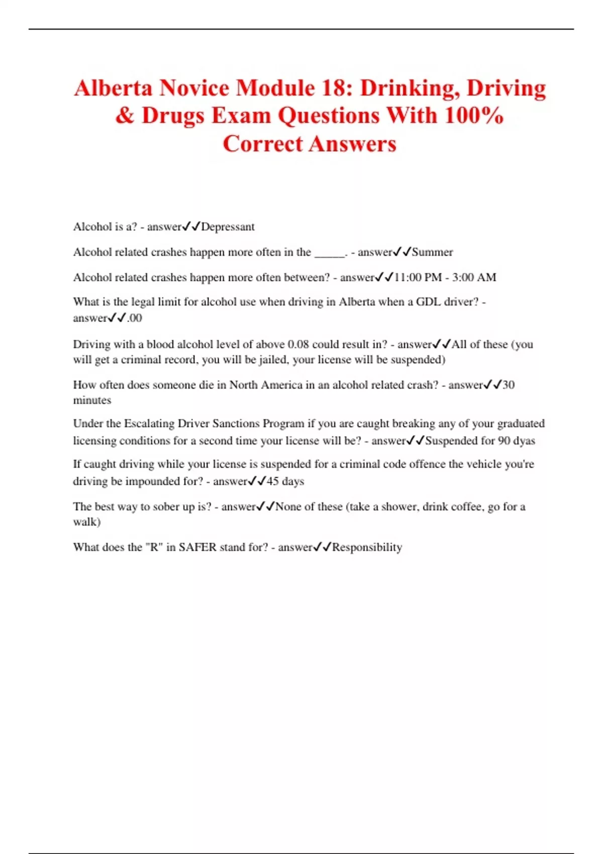 Alberta Novice Module 18: Drinking, Driving & Drugs Exam Questions With 100% Correct Answers Alcohol is a? - answerDepressant Alcohol related crashes happen more often in the _____. - answerSummer Alcohol related crashes happen more often between? - answer11:00 PM - 3:00 AM What is the legal limit for alcohol use when driving in Alberta when a GDL driver? - answer.00 Driving with a blood alcohol level of above 0.08 could result in? - answerAll of these (you will get a criminal record, you will be jailed, your license will be suspended) How often does someone die in Nor