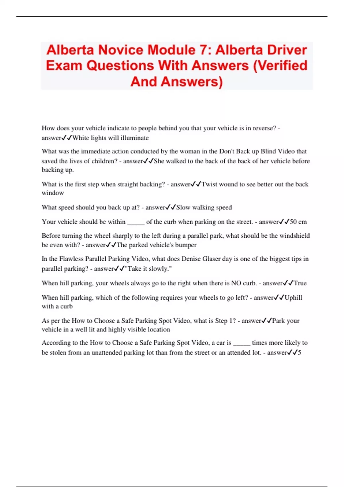 Alberta Novice Module 7: Alberta Driver Exam Questions With Answers (Verified And Answers) How does your vehicle indicate to people behind you that your vehicle is in reverse? - answerWhite lights will illuminate What was the immediate action conducted by the woman in the Don't Back up Blind Video that saved the lives of children? - answerShe walked to the back of the back of her vehicle before backing up. What is the first step when straight backing? - answerTwist wound to see better out the back window What speed should you back up at? - answerSlow walking speed