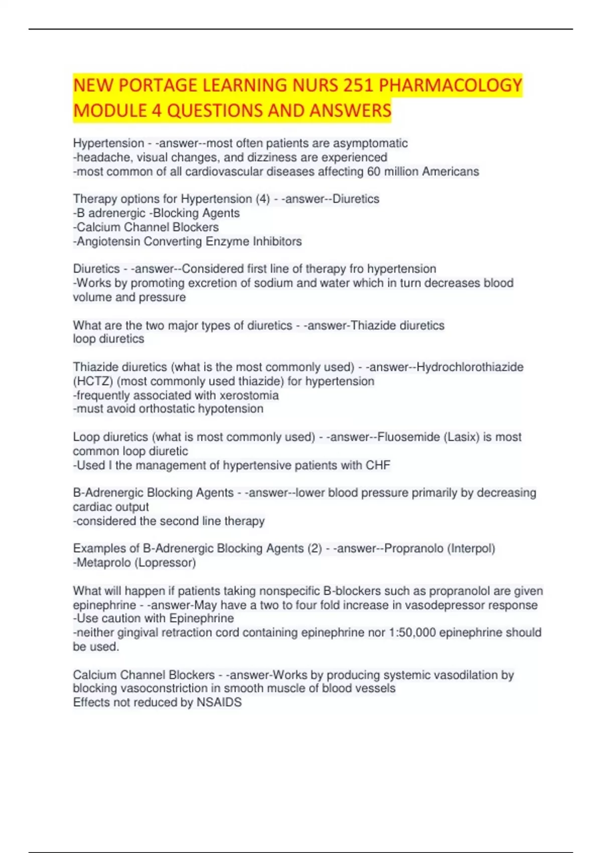 NEW PORTAGE LEARNING NURS 251 PHARMACOLOGY MODULE 4 QUESTIONS AND ANSWERS Hypertension - -answer--most often patients are asymptomatic -headache, visual changes, and dizziness are experienced -most common of all cardiovascular diseases affecting 60 million Americans Therapy options for Hypertension (4) - -answer--Diuretics -B adrenergic -Blocking Agents -Calcium Channel Blockers -Angiotensin Converting Enzyme Inhibitors Diuretics - -answer--Considered first line of therapy fro hypertension -Works by promoting excretion of sodium and water which in turn decreases blood volume and pressure What are the two major types of diuretics - -answer-Thiazide diuretics loop diuretics Thiazide diuretics (what is the most commonly used) - -answer--Hydrochlorothiazide (HCTZ) (most commonly used thiazide) for hypertension -frequently associated with xerostomia -must avoid orthostatic hypotension Loop diuretics (what is most commonly used) - -answer--Fluosemide (Lasix) is most common loop diuretic -Used I the management of hypertensive patients with CHF B-Adrenergic Blocking Agents - -answer--lower blood pressure primarily by decreasing cardiac output -considered the second line therapy