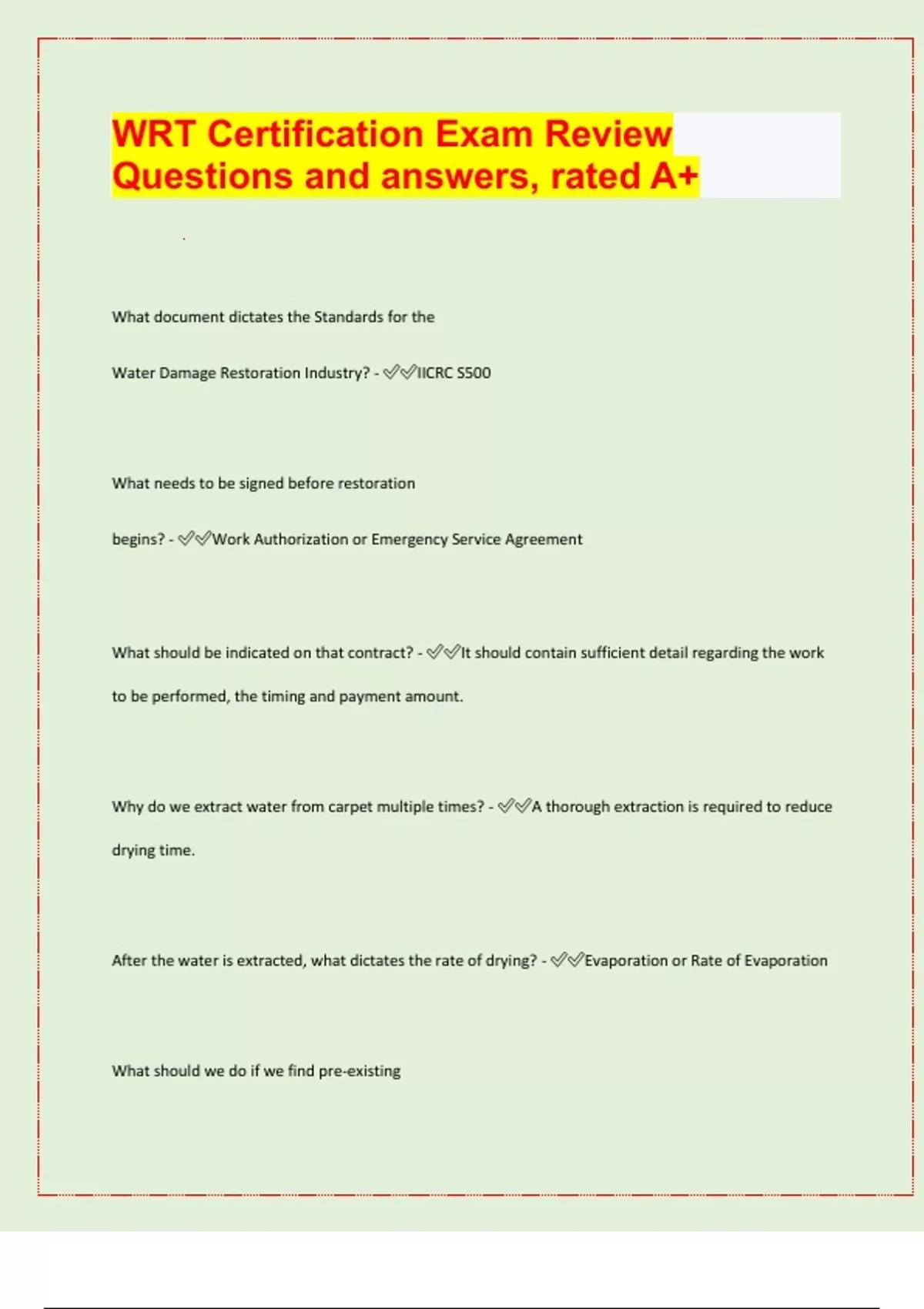 WRT Certification Exam Review Questions and answers, rated A+ What document dictates the Standards for the Water Damage Restoration Industry? - IICRC S500 What needs to be signed before restoration begins? - Work Authorization or Emergency Service Agreement What should be indicated on that contract? - It should contain sufficient detail regarding the work to be performed, the timing and payment amount. Why do we extract water from carpet multiple times? - A thorough extraction is required to reduce drying time. After the water is extracted, what dictates the rate of drying? - Evaporation or Rate of Evaporation What should we do if we find pre-existing damage? - Document and communicate. What two tools are necessary to disengage the carpet? - Knee Kicker and Carpet Awl What is delamination? - Separation of Carpet from 1st and 2nd backing. What can cause delamination? - Poor installment, stretching or folding. What should we do if we discover significant delamination on our project? - Document and communicate. Is it okay to cut carpet seams? - Only if necessary. What is the purpose of the skin on carpet cushion? - To help carpet s