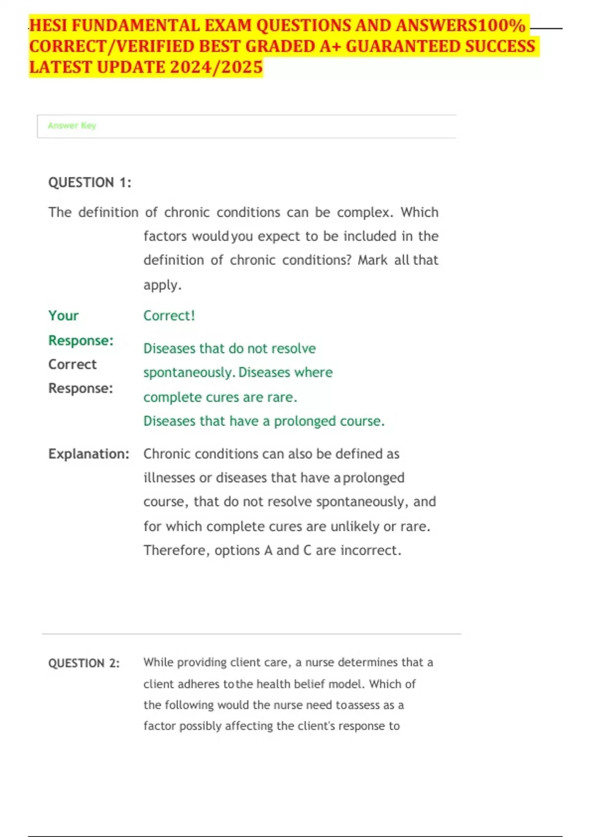 The definition of chronic conditions can be complex. Which factors would you expect to be included in the definition of chronic conditions? Mark all that apply. Your Response: Correct Response: Correct! Diseases that do not resolve spontaneously. Diseases where complete cures are rare. Diseases that have a prolonged course. Explanation: Chronic conditions can also be defined as illnesses or diseases that have a prolonged course, that do not resolve spontaneously, and for which complete cures are unlikely or rare. Therefore, options A and C are incorrect. QUESTION 2: While providing client care, a nurse determines that a client adheres to the health belief model. Which of the following would the nurse need to assess as a factor possibly affecting the client's response to illness? Your Response: Correct Response: Correct! Personality characteristics Explanation: The health belief model provides insight into the connection between the way a person sees his or her state of health, and that person's response to health, illness, and treatment. According to the health belief model, personality characteristics affect the person's response to illness. Nutritional awareness, stress management, and environmental sensitivity are wellness behaviors that promote healthy functioning and help prevent illness. QUESTION 3: A nurse has chosen to characterize a new initiative as "wellness promotion" rather than "health promotion." Which of the following statements best describes the difference between the concept of wellness and the concept Your Response: Correct Response: of health? c) Health is a state that can be promoted and protected by nursing practice, whereas wellness is solely dependent on the client. Wellness is an active state, whereas health is a more passive state dependent on the absence of disease. Explanation: Good health is a passive state wherein the person is not ill. Wellness is a more active state, regardless of one's level of health. Wellness is not contingent on the resolution of disease or illness and it supersedes age. Both health and wellness can be influenced by nursing practice. QUESTION 4: Which of the following is an example of tertiary health promotion? Your Response: Correct Response: Correct! Rehabilitation Explanation: Tertiary health promotion and disease prevention begins after an illness is diagnosed and treated to reduce disability and to help rehabilitate patients to a maximum level of functioning. Therefore, rehabilitation is an example of tertiary health promotion. Family counseling and Pap tests are examples of secondary health promotion. Water treatment is an example of primary health promotion QUESTION 5: A client makes a decision to quit smoking and joins a smoking cessation class. This is an example of which of Dunn's processes that help a person know who and what he or she is? Your Response: Correct Response: b) Being Befitting Explanation: Dunn defined processes that help a person know who and what he or she is. These processes, which are a part of each individual's perception of his or her own wellness state, are being (recognizing self as separate and individual), belonging (being part of a whole), becoming (growing and developing), and befitting (making personal choices to befit the self for the future). QUESTION 6: A rapid onset of symptoms that lasts a relatively short time indicates what health problem? Your Response: Correct Response: Correct! An acute illness Explanation: An acute illness generally has a rapid onset of symptoms and lasts a relatively short period of time. If medical care is required, a specific treatment with medications or surgery usually returns the person to normal functioning. Chronic illness is a broad term that encompasses many different physical and mental alterations in health. QUESTION 7: A client arrives at a health care facility complaining of pain in the abdomen and diarrhea. The physician diagnoses the client with colitis, an acute illness. Why is colitis considered an acute illness? Your Response: Correct Response: Correct! The onset is sudden. Explanation: Colitis in this case is an acute illness because the onset is sudden. Acute illnesses affect a person for a short duration and are cured in a short time. Acute illnesses are not difficult to treat and are curable. On the other hand, chronic illnesses have a gradual onset and require a longer period to be cured. In some cases, the illness may remain lifelong. QUESTION 8: A community health nurse arranges for a dental checkup camp for the local children in the school district. Which of the following would most likely be the nurse's goal for this health camp? Your Response: Correct Response: Correct! Health promotion Explanation: The education on lifestyle choices is part of health promotion activity, which focuses on protecting the person's health. The goal of the prevention of illness is to detect and prevent the illness. High-level wellness focuses on maximizing the person's highest potential for functioning. Reversal of self-care deficits would involve therapeutic interventions that are directed at contributing factors. QUESTION 9: to one's maximum potential while maintaining balance and purposeful direction in the environment. The Health Belief Model is used to describe health behaviors. A nurse is discussing cataract treatment with a client. Which of the following statements by the nurse would be most therapeutic? Your Response: Correct Response: Correct! "Have you ever thought of laser surgery?" Explanation: "Have you ever thought of laser surgery?" is a therapeutic response and encourages the client to express his views. Statements like, "You should try laser surgery"; "Why don't you try laser surgery"; and "My grandfather also benefited from laser surgery" are nontherapeutic and are equivalent to giving advice.