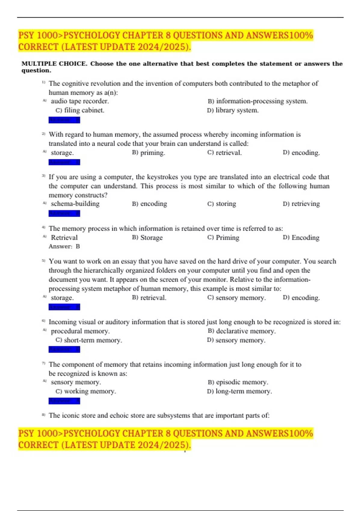 PSY 100>PSYCHOLOGY CHAPTER 8 QUESTIONS AND ANSWERS100% CORRECT (LATEST UPDATE 2024/2025).