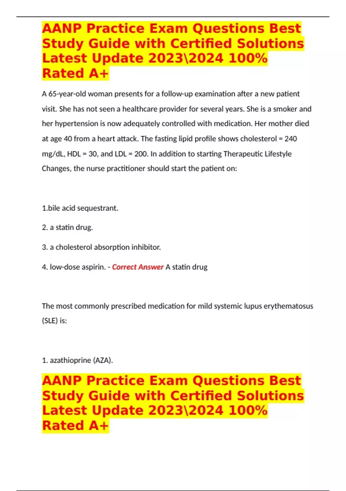 A 65-year-old woman presents for a follow-up examination after a new patient visit. She has not seen a healthcare provider for several years. She is a smoker and her hypertension is now adequately controlled with medication. Her mother died at age 40 from a heart attack. The fasting lipid profile shows cholesterol = 240 mg/dL, HDL = 30, and LDL = 200. In addition to starting Therapeutic Lifestyle Changes, the nurse practitioner should start the patient on: acid sequestrant. 2. a statin drug. 3. a cholesterol absorption inhibitor. 4. low-dose aspirin. - Correct Answer A statin drug The most commonly prescribed medication for mild systemic lupus erythematosus (SLE) is: 1. azathioprine (AZA). 2. belimumab (Benlysta). 3. ibuprofen (Advil). 4. cyclophosphamide (Cytoxan). - Correct Answer ibuprofen (advil) The most common sign of cervical cancer is: 1. postcoital bleeding. 2. strong odor from vaginal discharge. 3. itching in the vaginal area. 4. molluscum contagiosum. - Correct Answer postcoital bleeding The nurse practitioner prescribes amitriptyline (Elavil) for a patient with neuropathic pain secondary to diabetes mellitus. On follow-up, the patient complains of urine retention and dry mouth. The practitioner would: 1. discontinue amitriptyline and begin ibuprofen (Motrin). 2. refer to physical therapy. 3. start methocarbamol (Robaxin). 4. discontinue amitriptyline and begin gabapentin (Neurontin). - Correct Answer discontinue amitriptyline and begin gabapentin (neurontin) A 17-year-old male with rheumatoid arthritis is being treated with an NSAID and omeprazole (Prilosec). The patient complains of headache, abdominal pain, and gas. These symptoms are most likely: 1. associated with the omeprazole. 2. related to the underlying condition. 3. the result of the NSAID. 4. caused by viral gastroenteritis. - Correct Answer associated with the omeprazole The medication of choice for the initial treatment of juvenile rheumatoid arthritis is: 1. acetaminophen. 2. prednisone. 3. aspirin. 4. ibuprofen. - Correct Answer ibuprofen A 12-year-old with sickle cell anemia has recently experienced a sickle cell crisis and presents for a follow-up examination after a recent hospitalization. It is most important to continue monitoring growth, development, and: 1. white blood cell levels. 2. fecal occult blood test. 3. hemoglobin levels. 4. urine dipsticks. - Correct Answer hemoglobin levels A 90-year-old female is brought to the clinic by her neighbor. She states that everything is fine, but the nurse practitioner notes that she has poor hygiene and bruises on her trunk. The neighbor is concerned that the patient often has no money to buy food, despite income from social security and a coal miner's pension. The nurse practitioner suspects abuse. Which of the following is the nurse practitioner obligated to do next? 1. Report the case to the proper authorities. 2. Tell the neighbor to check on the woman daily and report back. 3. Document the data and report the information to risk management. 4. Call the patient's family and inquire about the concerns. - Correct Answer report the case to proper authorities In most cases, the first manifestation of Alzheimer's disease is: 1. impaired judgment. 2. decrease in short-term memory. 3. disorientation in time and place. 4. decrease in long-term memory. - Correct Answer decrease in short-term memory The optimal treatment for latent tuberculosis is: 1. rifampin (Rifadin) for 5 months. 2. isoniazid (Nydrazid) for 9 months. 3. pyrazinamide for 6 months. 4. ethambutol for 6 months. -
