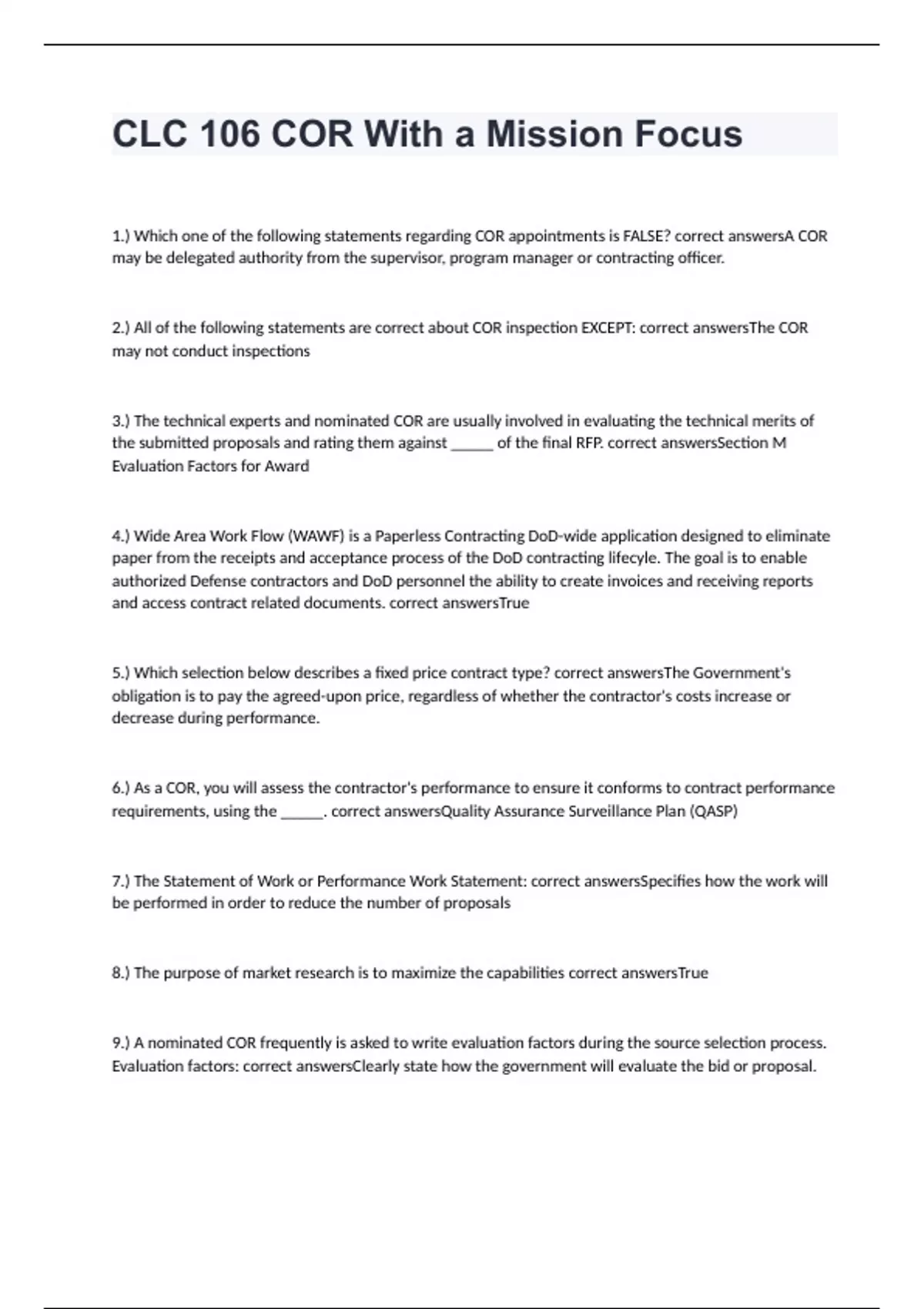 1.) Which one of the following statements regarding COR appointments is FALSE? correct answersA COR may be delegated authority from the supervisor, program manager or contracting officer. 2.) All of the following statements are correct about COR inspection EXCEPT: correct answersThe COR may not conduct inspections 3.) The technical experts and nominated COR are usually involved in evaluating the technical merits of the submitted proposals and rating them against _____ of the final RFP. correct answersSection M Evaluation Factors for Award 4.) Wide Area Work Flow (WAWF) is a Paperless Contracting DoD-wide application designed to eliminate paper from the receipts and acceptance process of the DoD contracting lifecyle. The goal is to enable authorized Defense contractors and DoD personnel the ability to create invoices and receiving reports and access contract related documents. correct answersTrue 5.) Which selection below describes a fixed price contract type? correct answersThe Government's obligation is to pay the agreed-upon price, regardless of whether the contractor's costs increase or decrease during performance.
