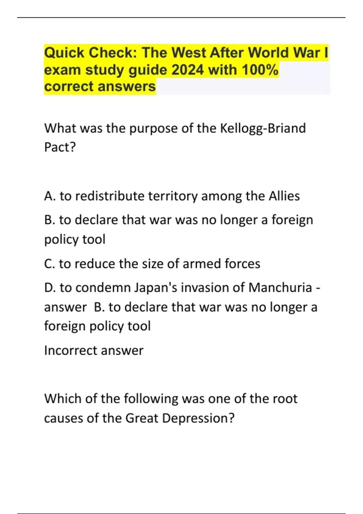 What was the purpose of the Kellogg-Briand Pact? A. to redistribute territory among the Allies B. to declare that war was no longer a foreign policy tool C. to reduce the size of armed forces D. to condemn Japan's invasion of Manchuria B. to declare that war was no longer a foreign policy tool Incorrect answer Which of the following was one of the root causes of the Great Depression? A. overspending by farmers B. lower interest rates set by the Federal Reserve C. overproduction by factories D. too much regulation of the stock market C. overproduction by factories How did the government of the United States react to the Great Depression? A. It immediately provided major assistance to the needy and strictly regulated the stock market. B. It eventually raised interest rates after many banks and businesses had already closed. C. It immediately took control of the stock market and later raised interest rates. D. It provided minimal assistance initially but eventually increased assistance and market regulation. D. It provided minimal assistance initially but eventually increased assistance and market regulation. Which of the following was an indirect result of the work of Einstein and Curie? A. the atomic bomb B. penicillin C. psychoanalysis D. the theory of relativity A. the atomic bomb What was the significance of the flapper in the 1920s? A. The majority of women followed styles set by the flappers. B. The flappers showed that women and men had achieved equality. C. Flappers represented a return to prewar normalcy. D. The flapper became a symbol of freedom and rebelliousness. The flapper became a symbol of freedom and rebelliousness. Which of the following did the League of Nations face following WWI? A. It was forced to move from its headquarters in Geneva, Switzerland. B. It had many members, including the United States, but not Germany. C. It had no military means to stop invasions and other aggressive foreign policies. D. It could not convince Germany or France to sign the Locarno Treaties. C. It had no military means to stop invasions and other aggressive foreign policies. What caused the U.S. stock market to crash in 1929? A. There was a financial panic after investors were unable to repay loans to brokers. B. High tariffs raised prices, which crippled world trade. C. Banks across the country were forced to close. D. A large drought caused defaults on farm mortgages. A. There was a financial panic after investors were unable to repay loans to brokers.