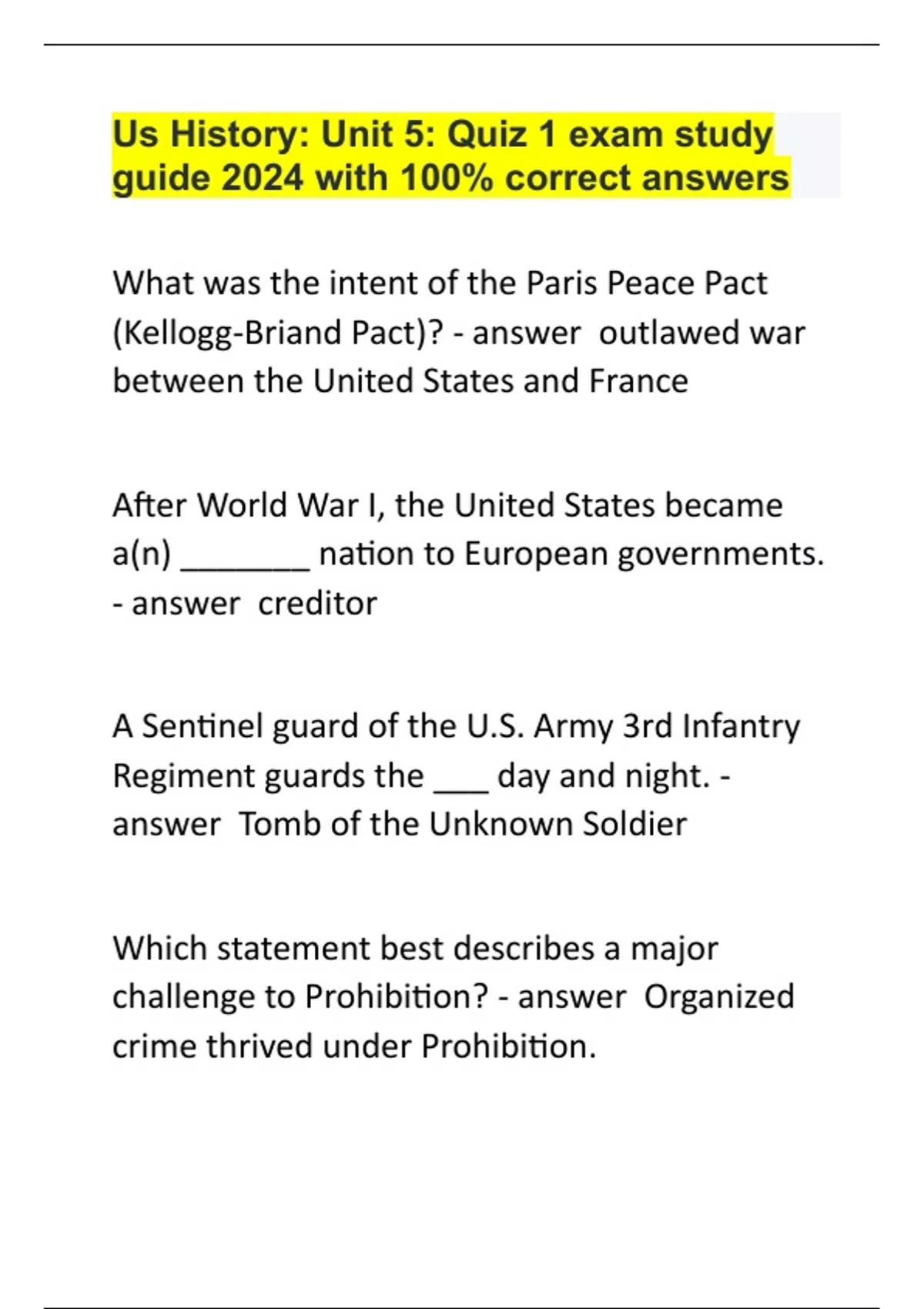 Us History Unit 5 Quiz 1 exam study guide 2024 with 100% correct answers.