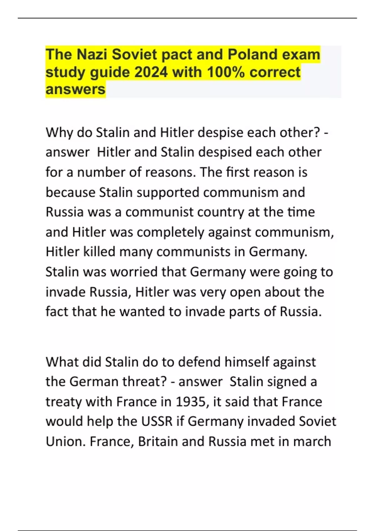 The Nazi Soviet pact and Poland exam study guide 2024 with 100% correct answers