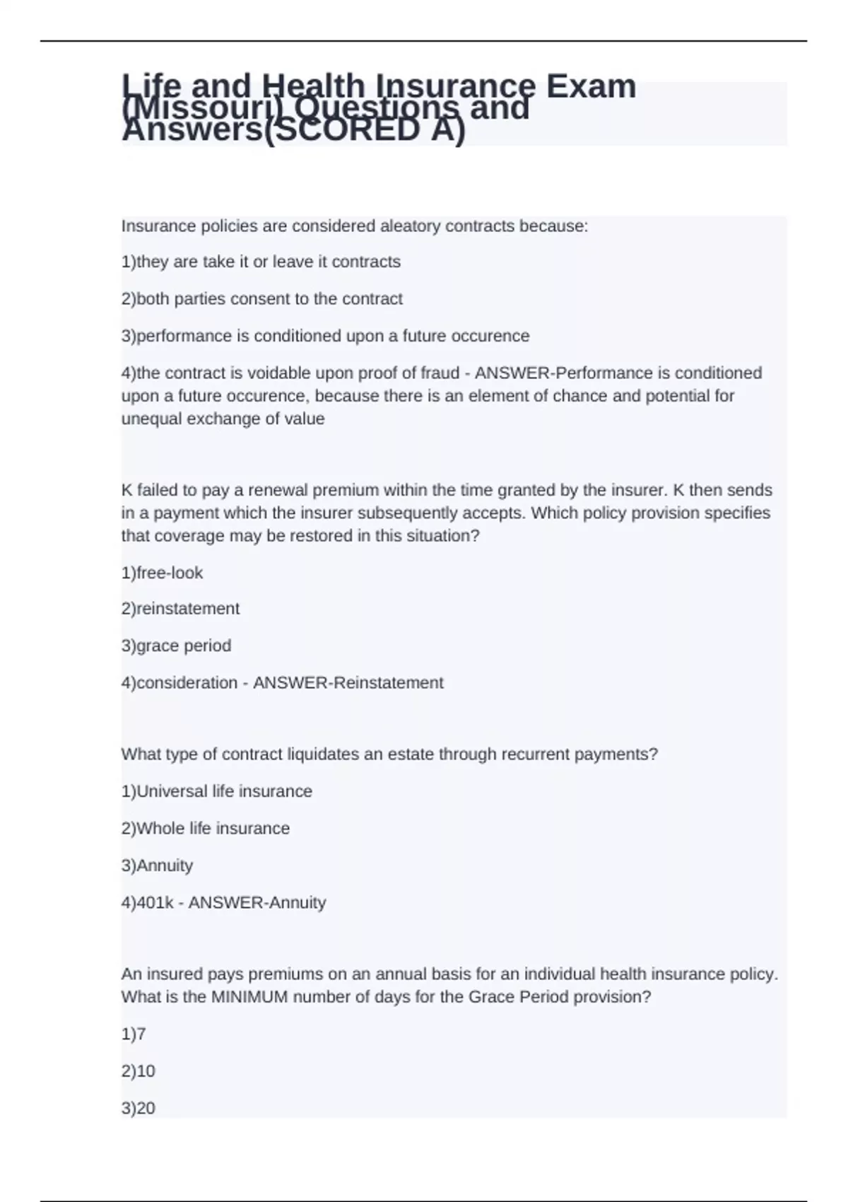 Insurance policies are considered aleatory contracts because: 1)they are take it or leave it contracts 2)both parties consent to the contract 3)performance is conditioned upon a future occurence 4)the contract is voidable upon proof of fraud - ANSWER-Performance is conditioned upon a future occurence, because there is an element of chance and potential for unequal exchange of value K failed to pay a renewal premium within the time granted by the insurer. K then sends in a payment which the insurer subsequently accepts. Which policy provision specifies that coverage may be restored in this situation? 1)free-look 2)reinstatement 3)grace period 4)consideration - ANSWER-Reinstatement What type of contract liquidates an estate through recurrent payments? 1)Universal life insurance 2)Whole life insurance 3)Annuity 4)401k - ANSWER-Annuity An insured pays premiums on an annual basis for an individual health insurance policy. What is the MINIMUM number of days for the Grace Period provision?