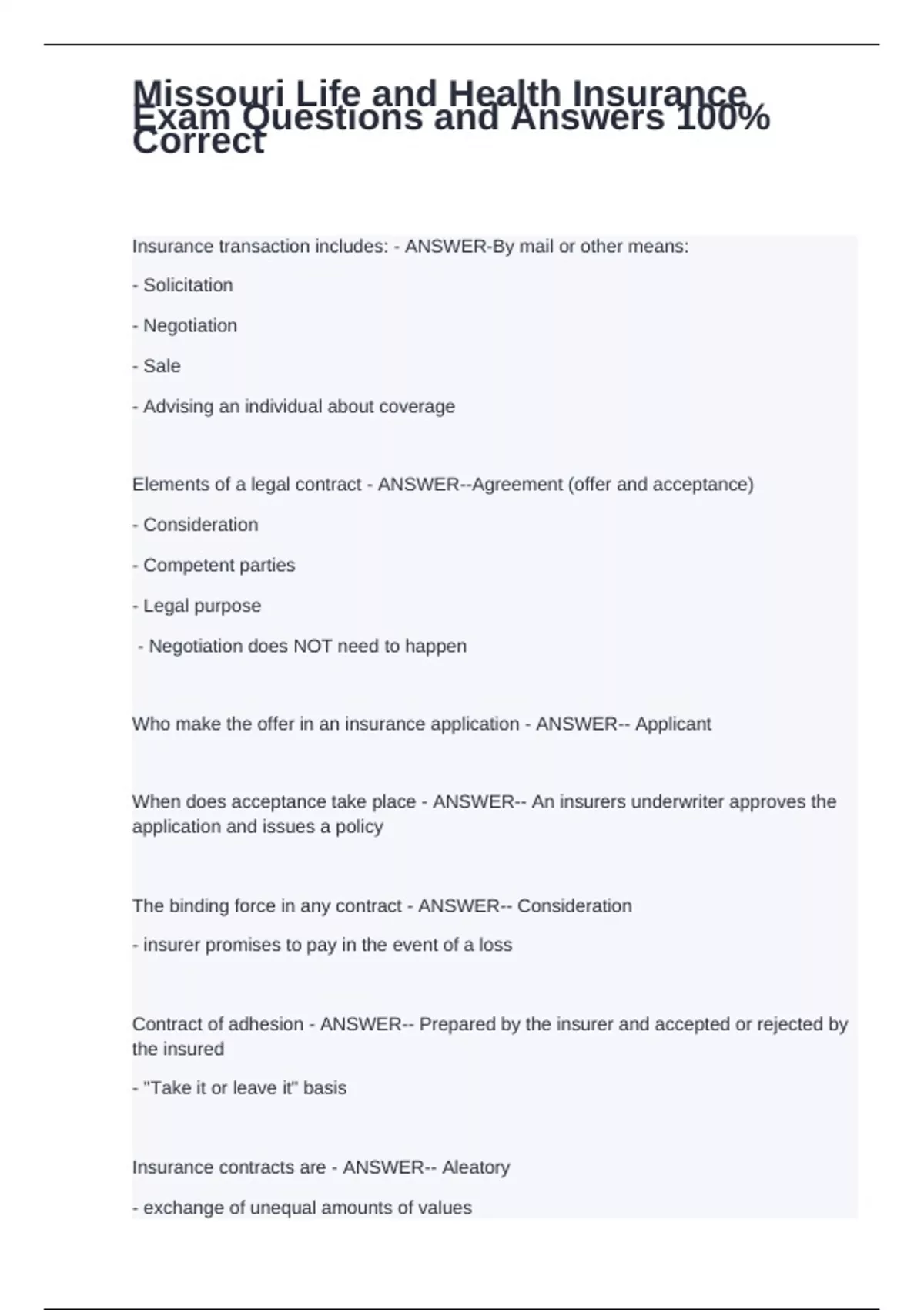 Insurance transaction includes: - ANSWER-By mail or other means: - Solicitation - Negotiation - Sale - Advising an individual about coverage Elements of a legal contract - ANSWER--Agreement (offer and acceptance) - Consideration - Competent parties - Legal purpose - Negotiation does NOT need to happen Who make the offer in an insurance application - ANSWER-- Applicant When does acceptance take place - ANSWER-- An insurers underwriter approves the application and issues a policy The binding force in any contract - ANSWER-- Consideration - insurer promises to pay in the event of a loss Contract of adhesion - ANSWER-- Prepared by the insurer and accepted or rejected by the insured - "Take it or leave it" basis Insurance contracts are - ANSWER-- Aleatory - exchange of unequal amounts of values