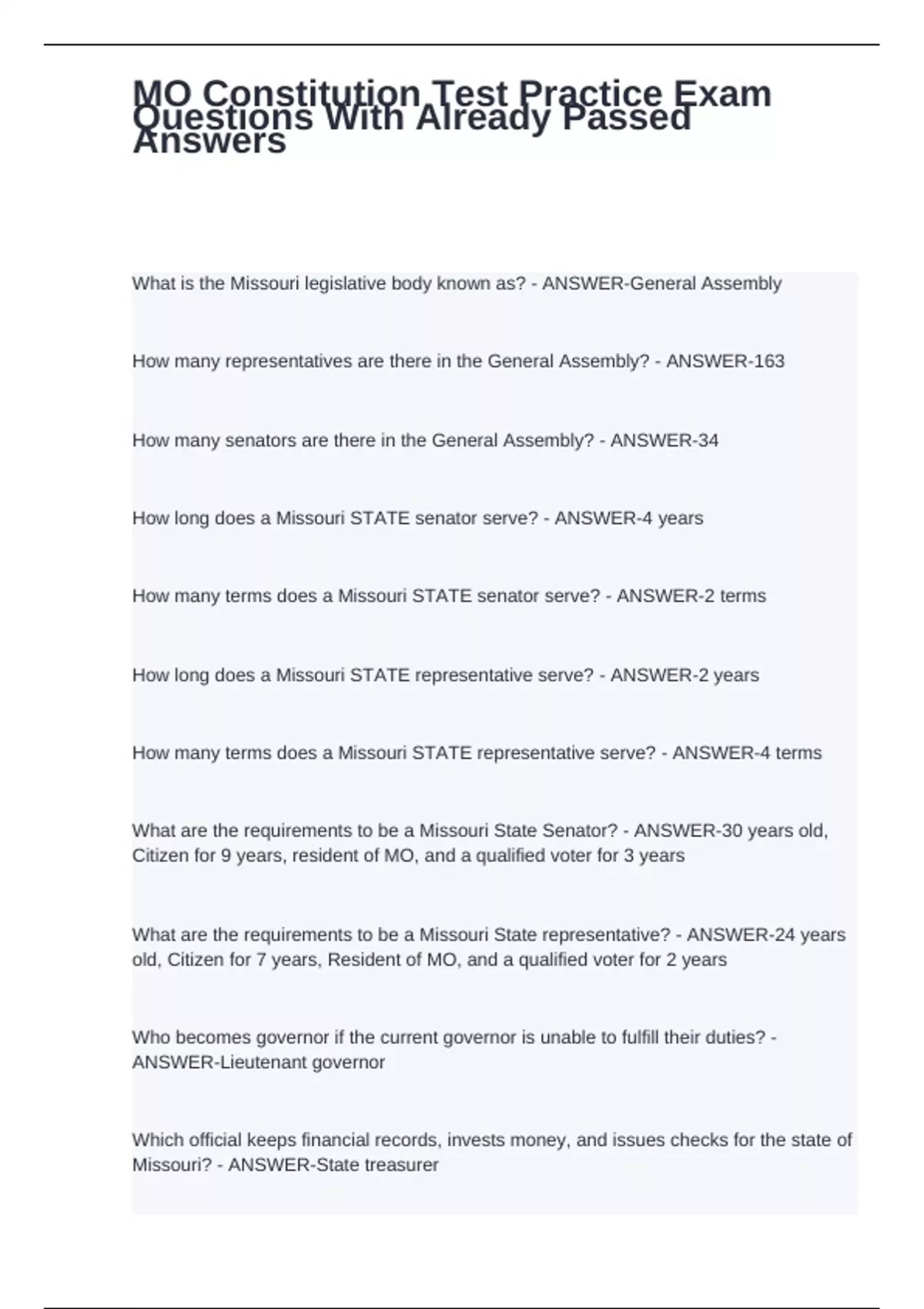 MO Constitution Test Practice Exam Questions With Already Passed Answers