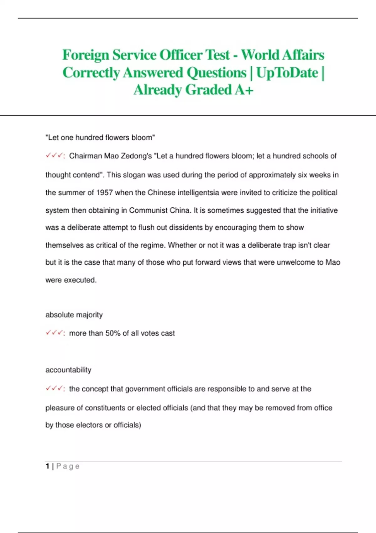 Foreign Service Officer Test - World Affairs Correctly Answered Questions| UpToDate | Already Graded A+
