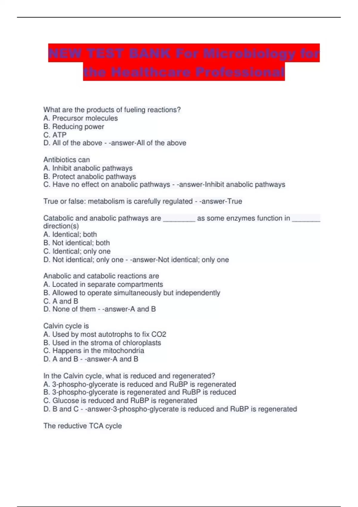 NEW TEST BANK For Microbiology for the Healthcare Professional What are the products of fueling reactions? A. Precursor molecules B. Reducing power C. ATP D. All of the above - -answer-All of the above Antibiotics can A. Inhibit anabolic pathways B. Protect anabolic pathways C. Have no effect on anabolic pathways - -answer-Inhibit anabolic pathways True or false: metabolism is carefully regulated - -answer-True Catabolic and anabolic pathways are ________ as some enzymes function in _______ direction(s) A. Identical; both B. Not identical; both C. Identical; only one D. Not identical; only one - -answer-Not identical; only one Anabolic and catabolic reactions are A. Located in separate compartments B. Allowed to operate simultaneously but independently C. A and B D. None of them - -answer-A and B Calvin cycle is A. Used by most autotrophs to fix CO2 B. Used in the stroma of chloroplasts C. Happens in the mitochondria D. A and B - -answer-A and B In the Calvin cycle, what is reduced and regenerated? A. 3-phospho-glycerate is reduced and RuBP is regenerated B. 3-phospho-glycerate is regenerated and RuBP is reduced C. Glucose is reduced and RuBP is regenerated D. B and C - -answer-3-phospho-glycerate is reduced and RuBP is regenerated The reductive TCA cycle A. Is a CO2 fixation pathway B. Runs the same way as the oxidative TCA cycle C. Runs the opposite way of the oxidative TCA cycle D. A and C - -answer-A and C In gluconeogenesis, synthesis of glucose and related sugars is done by starting with A. Fructose B. Glucose C. Non-glucose precursors D. Genesis precursors - -answer-Non-glucose precursors Gluconeogenesis and glycolysis A. Are functionally reverses of each other B. Are functionally the same C. Are both catabolic processes