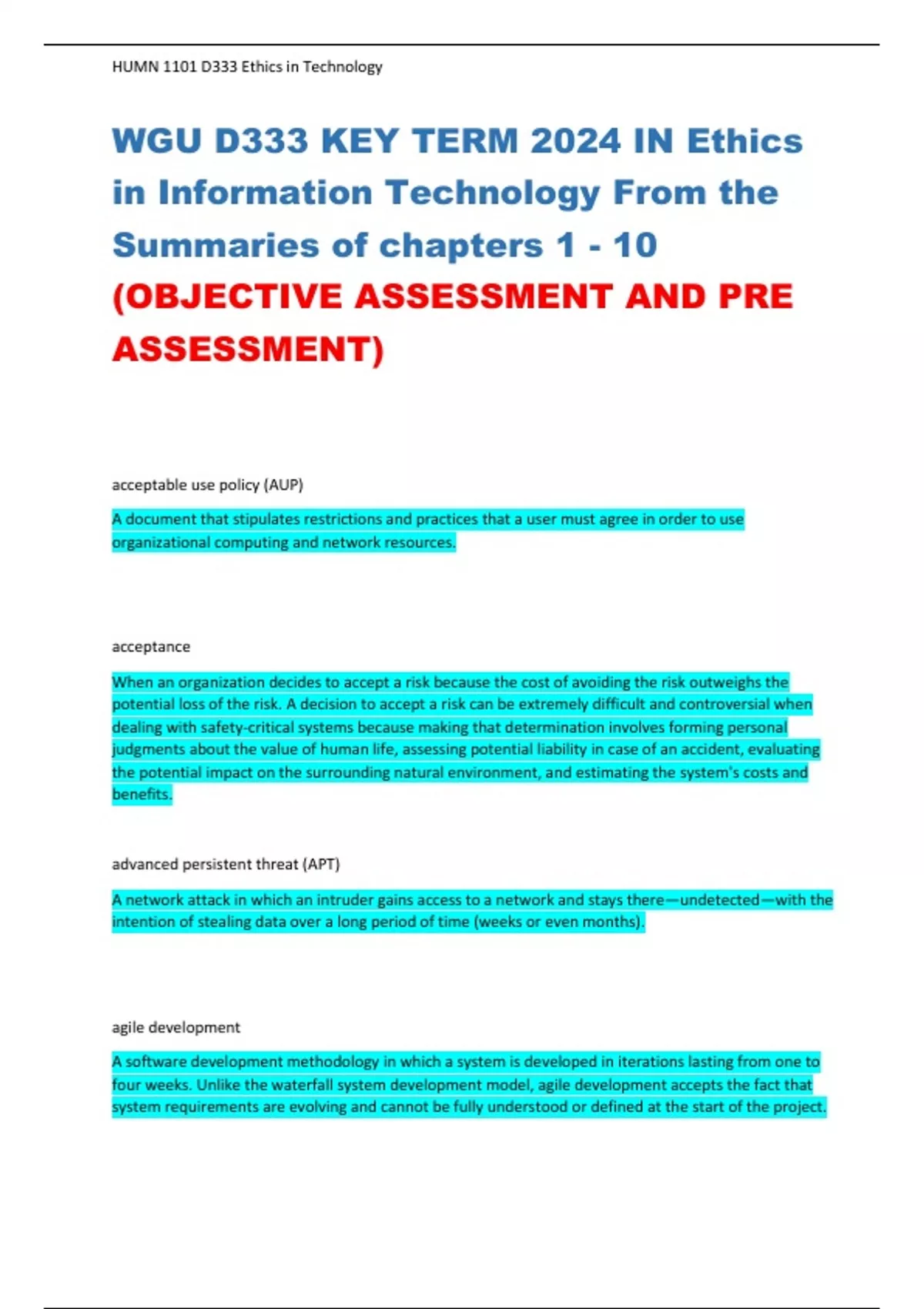 WGU D333 KEY TERM 2024 IN Ethics in Information Technology From the Summaries of chapters 1 - 10 (OBJECTIVE ASSESSMENT AND PRE ASSESSMENT)