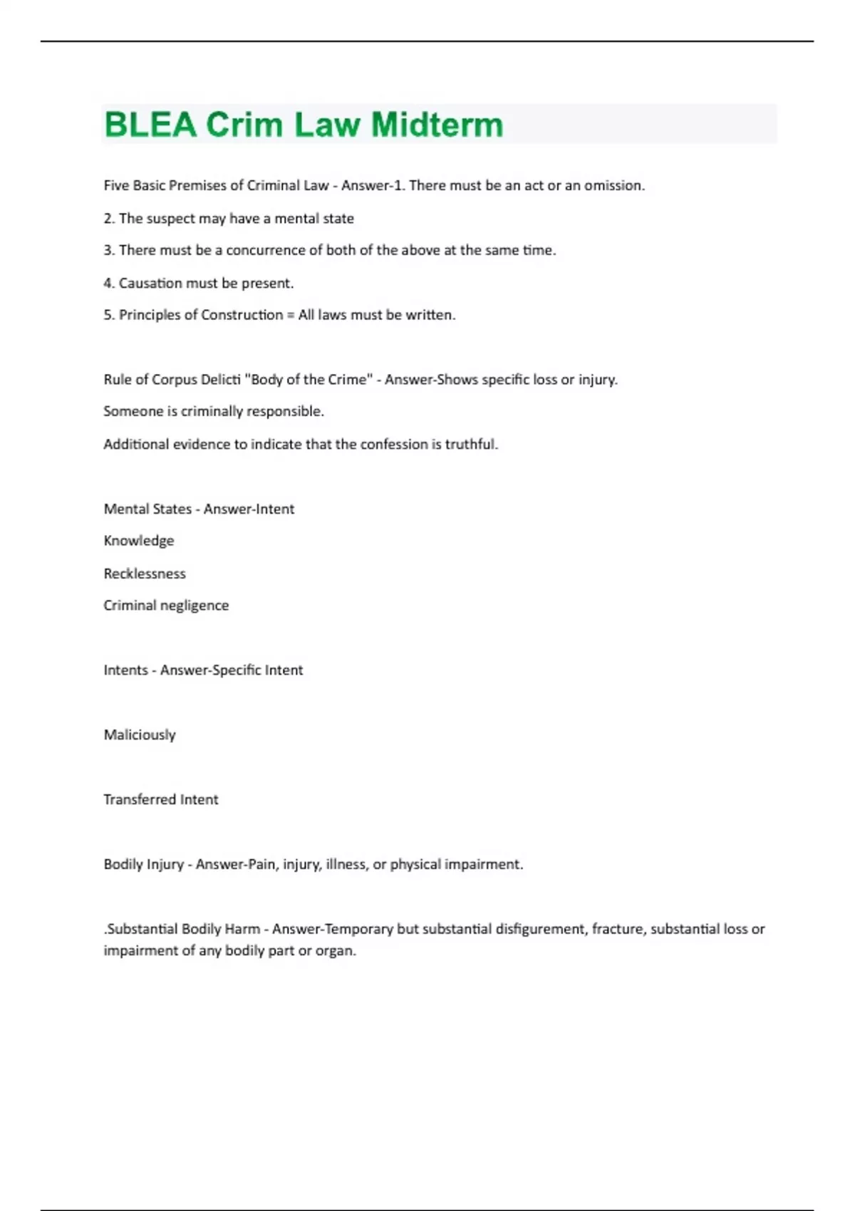 BLEA Crim Law Midterm Questions & Answers Correctly Answered.