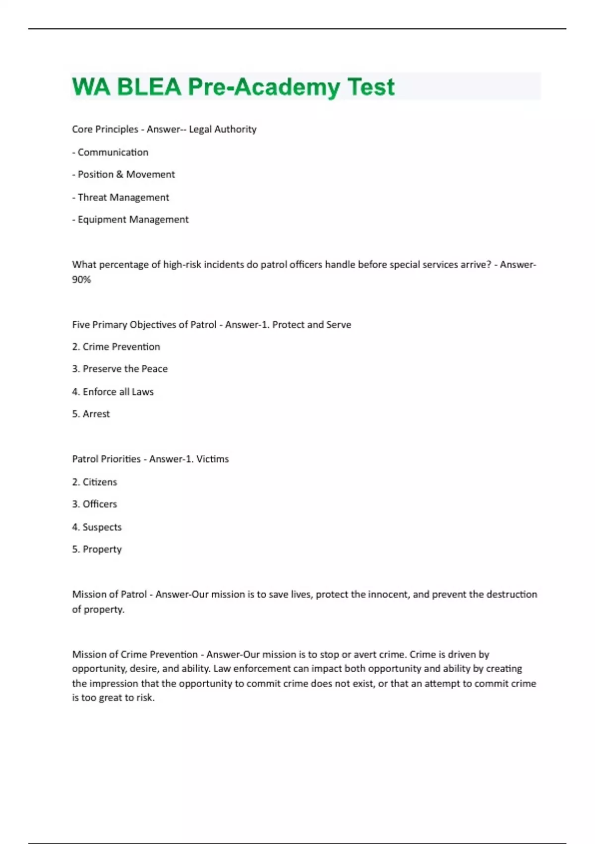 Core Principles - Answer-- Legal Authority - Communication - Position & Movement - Threat Management - Equipment Management What percentage of high-risk incidents do patrol officers handle before special services arrive? - Answer- 90% Five Primary Objectives of Patrol - Answer-1. Protect and Serve 2. Crime Prevention 3. Preserve the Peace 4. Enforce all Laws 5. Arrest Patrol Priorities - Answer-1. Victims 2. Citizens 3. Officers 4. Suspects 5. Property Mission of Patrol - Answer-Our mission is to save lives, protect the innocent, and prevent the destruction of property. Mission of Crime Prevention - Answer-Our mission is to stop or avert crime. Crime is driven by opportunity, desire, and ability. Law enforcement can impact both opportunity and ability by creating the impression that the opportunity to commit crime does not exist, or that an attempt to commit crime is too great to risk.Mission of Preserving the Peace - Answer-Our mission is to uphold the constitutional rights of the masses while protecting the lives and property of the individual. Mission of Enforcing all Laws - Answer-Our mission is to regulate public conduct and protect people from themselves and others. - We enforce all laws enacted by the legislature. - Civil Infractions (fines only), Misdemeanors and Gross Misdemeanors (fines and up to a year in jail), and Felonies (fines and a year or more in prison) - We help civil organizations like child protective services, department of social and health services (DSHS), adult protection services (APS), hospitals, and fire departments by taking 'protective custody' of people at risk. Mission of Arrest - Answer-Our mission is to remove people who endanger the communities we serve. Therefore, we have the authority to: - Take away an offender's ability to commit crime - Remove an individual's right to freedom (which is the most dangerous part of our job) - Use reasonable and necessary force to accomplish this task What is the most dangerous part of our job? - Answer-Removing an individuals right to freedom Patrol Responsibilities (four major resp when resp to police calls) - Answer-1. Communicate 2. Coordinate 3. Command 4. ControlCommunicate Responsibilities - Answer-- notify dispatch when you are en-route, ETA, on scene - answer status checks - conduct records checks - notify dispatch when your status or location changes - relay any additional suspect descriptions - notify dispatch any time you transport someone or after you clear a call