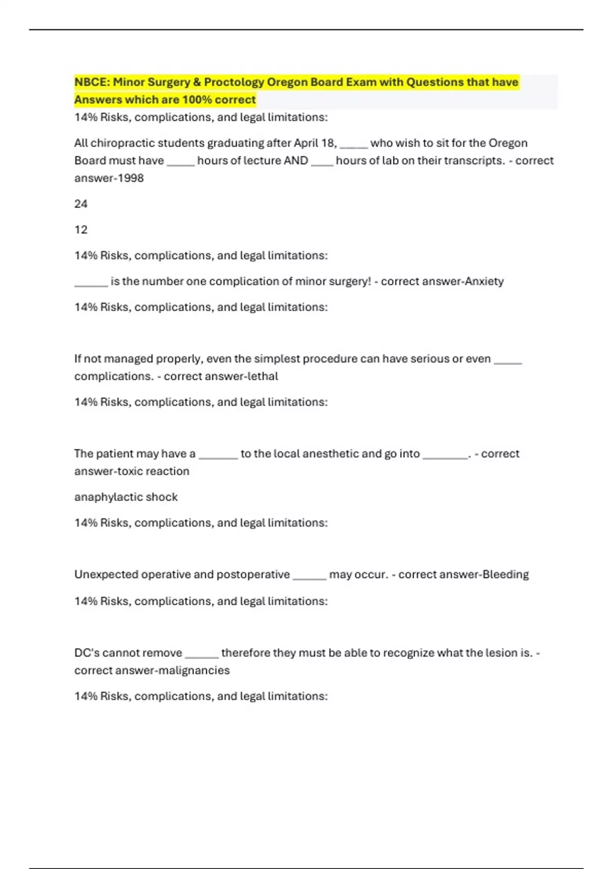 NBCE: Minor Surgery & Proctology Oregon Board Exam with Questions that have Answers which are 100% correct