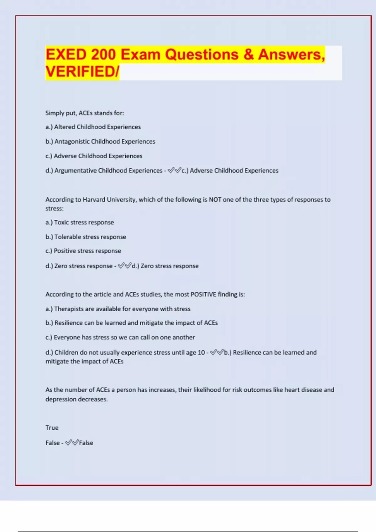 EXED 200 Exam Questions & Answers, VERIFIED/ Simply put, ACEs stands for: a.) Altered Childhood Experiences b.) Antagonistic Childhood Experiences c.) Adverse Childhood Experiences d.) Argumentative Childhood Experiences - c.) Adverse Childhood Experiences According to Harvard University, which of the following is NOT one of the three types of responses to stress: a.) Toxic stress response b.) Tolerable stress response c.) Positive stress response d.) Zero stress response - d.) Zero stress response According to the article and ACEs studies, the most POSITIVE finding is: a.) Therapists are available for everyone with stress b.) Resilience can be learned and mitigate the impact of ACEs c.) Everyone has stress so we can call on one another d.) Children do not usually experience stress until age 10 - b.) Resilience can be learned and mitigate the impact of ACEs As the number of ACEs a person has increases, their likelihood for risk outcomes like heart disease and depression decreases. True False - False Which of the following best describes "inclusive education"? a.) Allowing all students with disabilities to fully participate in general education classes. b.) Providing a least restrictive environment for students with disabilities by insuring they are always in general education classrooms. c.) Integrating students with disabilities with students who do not, in the least restrictive environment and to the maximum extent possible. d.) Having students without disabilities attend all general education classrooms even if it means they do not have the necessary supports. - c.) Integrating students with disabilities with students who do not, in the least restrictive environment and to the maximum extent possible. Special education serves individuals with disabilities up until the age of ______. a.) 21 b.) 19 c.) 20 d.) 18 - a.) 21 Which law was the first version that stated all students have the right to a free and appropriate public education (FAPE)? a.) Least Restrictive Environment (LRE) b.) Americans with Disabilities Act (ADA) c.) Section 504 d.) Public Law (PL) 94-142, the Education for all Handicapped Children Act (EHA) - d.) Public Law (PL) 94-142, the Education for all Handicapped
