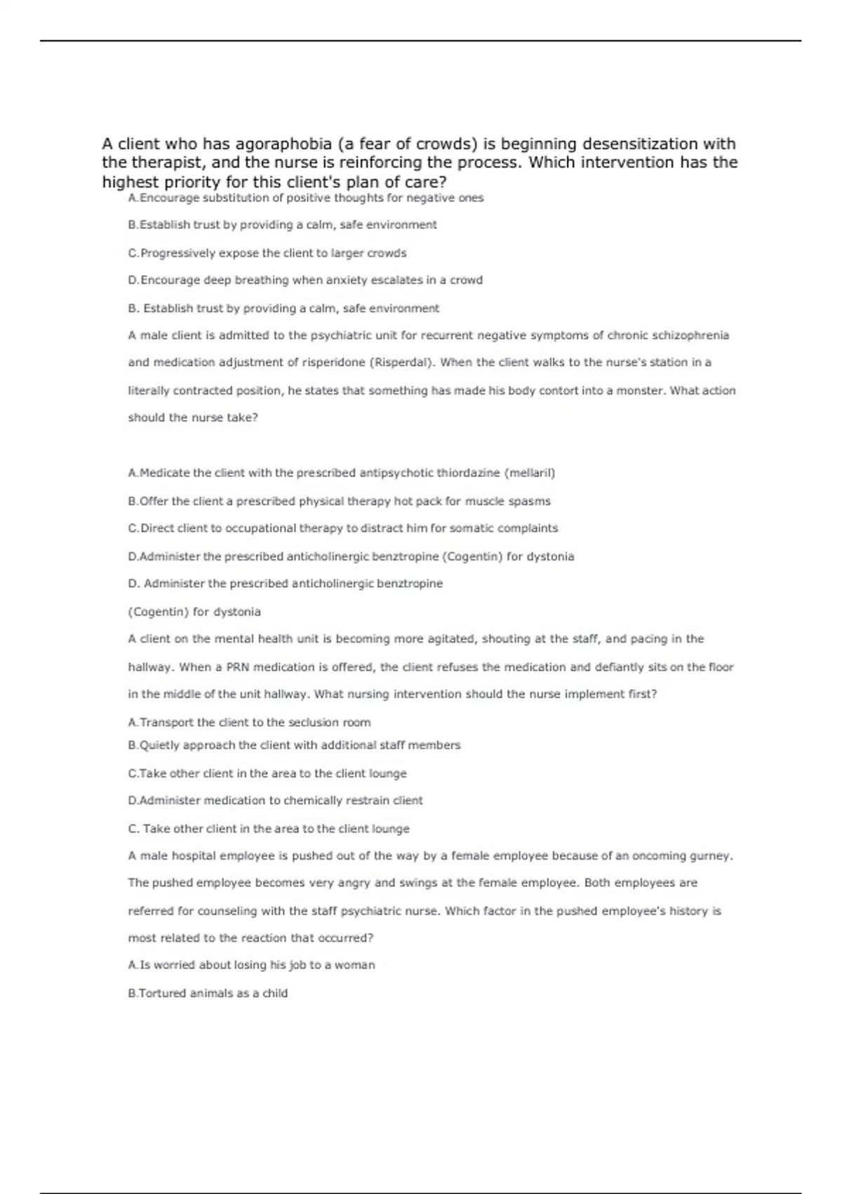 h trust by providing a calm, safe environment C.Progressively expose the client to larger crowds D.Encourage deep breathing when anxiety escalates in a crowd B. Establish trust by providing a calm, safe environment A male client is admitted to the psychiatric unit for recurrent negative symptoms of chronic schizophrenia and medication adjustment of risperidone (Risperdal). When the client walks to the nurse's station in a literally contracted position, he states that something has made his body contort into a monster. What action should the nurse take? A.Medicate the client with the prescribed antipsychotic thiordazine (mellaril) B.Offer the client a prescribed physical therapy hot pack for muscle spasms C.Direct client to occupational therapy to distract him for somatic complaints D.Administer the prescribed anticholinergic benztropine (Cogentin) for dystonia D. Administer the prescribed anticholinergic benztropine (Cogentin) for dystonia A client on the mental health unit is becoming more agitated, shouting at the staff, and pacing in the hallway. When a PRN medication is offered, the client refuses the medication and defiantly sits on the floor in the middle of the unit hallway. What nursing intervention should the nurse implement first? A.Transport the client to the seclusion room B.Quietly approach the client with additional staff members C.Take other client in the area to the client lounge D.Administer medication to chemically restrain client C. Take other client in the area to the client lounge A male hospital employee is pushed out of the way by a female employee because of an oncoming gurney. The pushed employee becomes very angry and swings at the female employee. Both employees are referred for counseling with the staff psychiatric nurse. Which factor in the pushed employee's history is most related to the reaction that occurred? A.Is worried about losing his job to a woman B.Tortured animals as a child C.Was physically abused by his mother D.Hates to be touched by anyone C. Was physically abused by his mother Which nursing actions are likely to help promote the self-esteem of a male client with moderate depression? (Select all that apply) A.Ask the client what his long-term goals are B.Discuss the challenges of his medical condition C. Include the client in determining treatment protocol D.Encourage the client to engage in recreational therapy E.Provide opportunities for the client to discuss his concerns C. Include the client in determining treatment protocol D. Encourage the client to engage in recreational therapy A client who is admitted to the mental health unit reports shortness of breath and dizziness. The client tells the nurse, "I feel like I am going to die," which nursing problem should the nurse include in this client's plan of care? A.Mood disturbance B.Moderate anxiety C.Altered thoughts D.Social isolation B. Moderate anxiety An adolescent male receives a prescription for an antidepressant drug because he is exhibiting a depressed affect. While the client taking the antidepressant, which comparison of the client's behavior before and after taking the drug is most important for the nurse to obtain? A. His appetite B. The emotional quality of his attitude C. His level of activity D. The interactions he has with others B. The emotional quality of his attitude