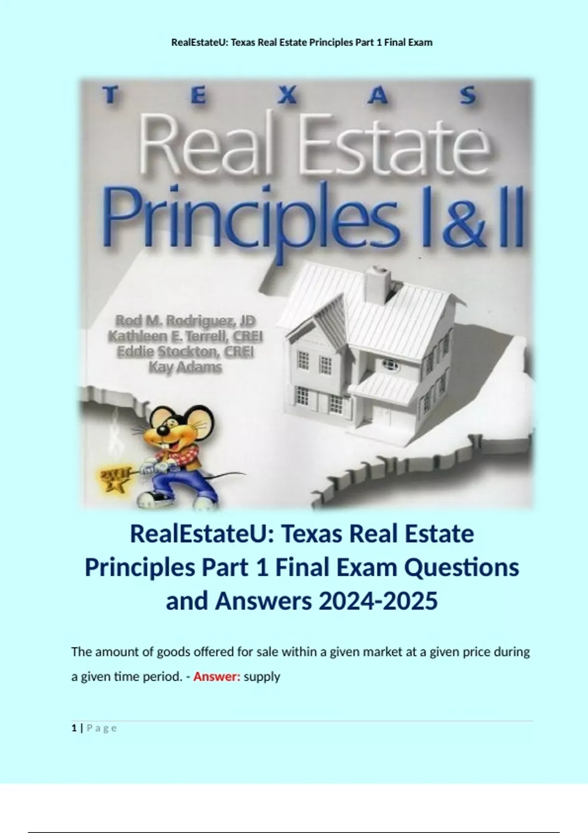 RealEstateU: Texas Real Estate Principles Part 1 Final Exam Questions and Answers . Terms like: The amount of goods offered for sale within a given market at a given price during a given time period. - Answer: supply
