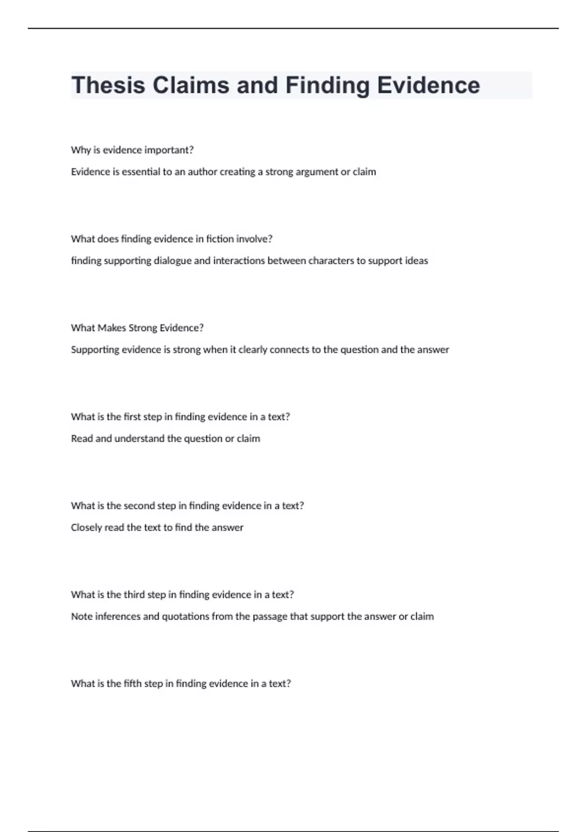 Thesis Claims and Finding Evidence well answered to passWhy is evidence important? Evidence is essential to an author creating a strong argument or claim What does finding evidence in fiction involve? finding supporting dialogue and interactions between characters to support ideas What Makes Strong Evidence? Supporting evidence is strong when it clearly connects to the question and the answer What is the first step in finding evidence in a text? Read and understand the question or claim What is the second step in finding evidence in a text? Closely read the text to find the answer What is the third step in finding evidence in a text? Note inferences and quotations from the passage that support the answer or claim