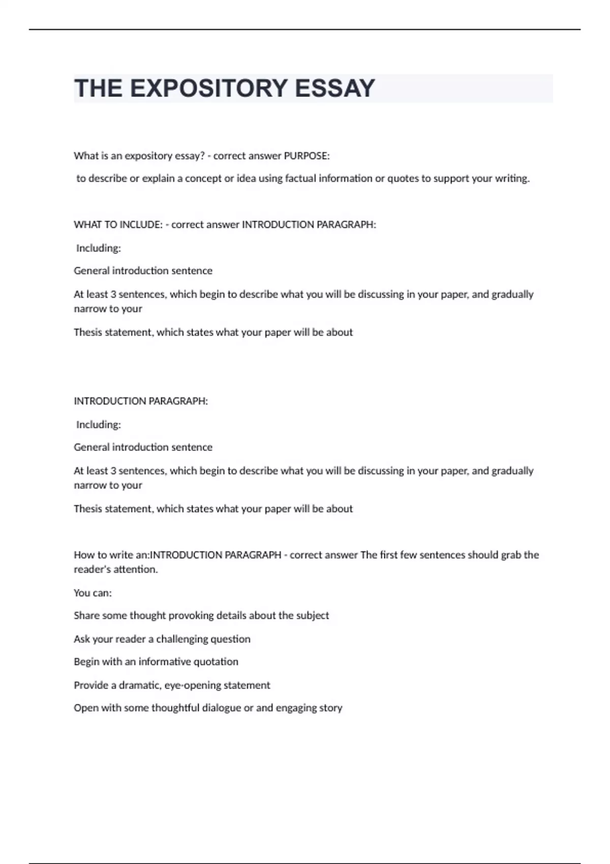 THE EXPOSITORY ESSAY with complete solutions What is an expository essay? - correct answer PURPOSE: to describe or explain a concept or idea using factual information or quotes to support your writing. WHAT TO INCLUDE: - correct answer INTRODUCTION PARAGRAPH: Including: General introduction sentence At least 3 sentences, which begin to describe what you will be discussing in your paper, and gradually narrow to your Thesis statement, which states what your paper will be about INTRODUCTION PARAGRAPH: Including: General introduction sentence At least 3 sentences, which begin to describe what you will be discussing in your paper, and gradually narrow to your Thesis statement, which states what your paper will be about How to write an:INTRODUCTION PARAGRAPH - correct answer The first few sentences should grab the reader's attention. You can: Share some thought provoking details about the subject Ask your reader a challenging question Begin with an informative quotation Provide a dramatic, eye-opening statement Open with some thoughtful dialogue or and engaging story