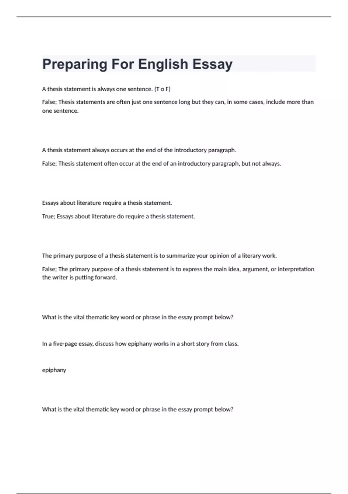 Preparing For English EssayA thesis statement is always one sentence. (T o F) False; Thesis statements are often just one sentence long but they can, in some cases, include more than one sentence. A thesis statement always occurs at the end of the introductory paragraph. False; Thesis statement often occur at the end of an introductory paragraph, but not always. Essays about literature require a thesis statement. True; Essays about literature do require a thesis statement. The primary purpose of a thesis statement is to summarize your opinion of a literary work. False; The primary purpose of a thesis statement is to express the main idea, argument, or interpretation the writer is putting forward. What is the vital thematic key word or phrase in the essay prompt below? In a five-page essay, discuss how epiphany works in a short story from class. epiphany What is the vital thematic key word or phrase in the essay prompt below?