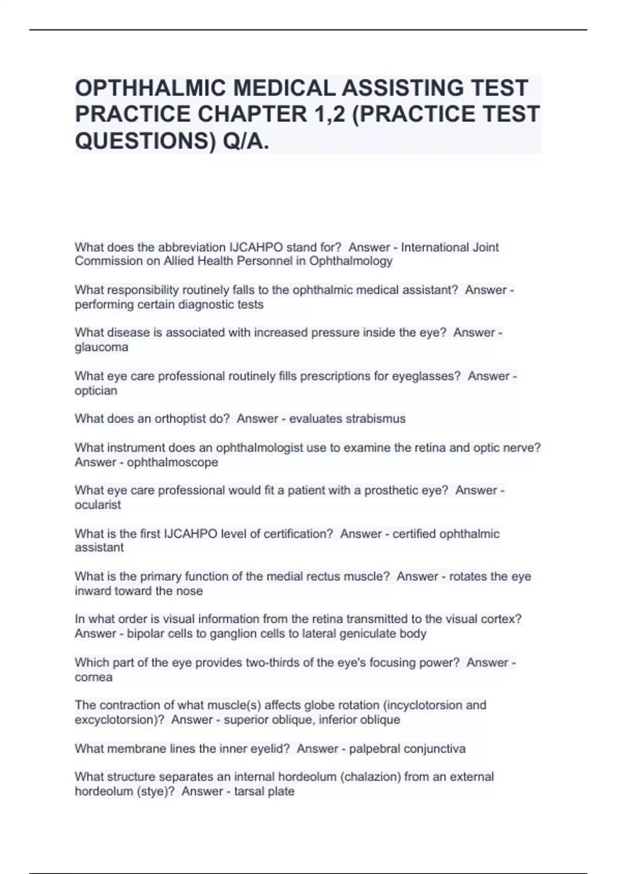OPTHHALMIC MEDICAL ASSISTING TEST PRACTICE CHAPTER 1,2 (PRACTICE TEST QUESTIONS) Q/A.