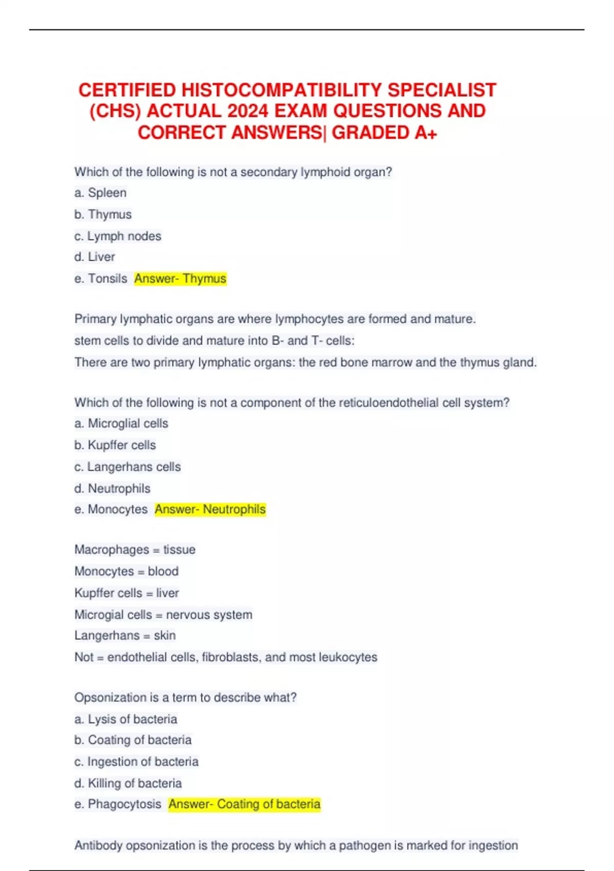 CERTIFIED HISTOCOMPATIBILITY SPECIALIST (CHS) ACTUAL 2024 EXAM QUESTIONS AND CORRECT ANSWERS| GRADED A+