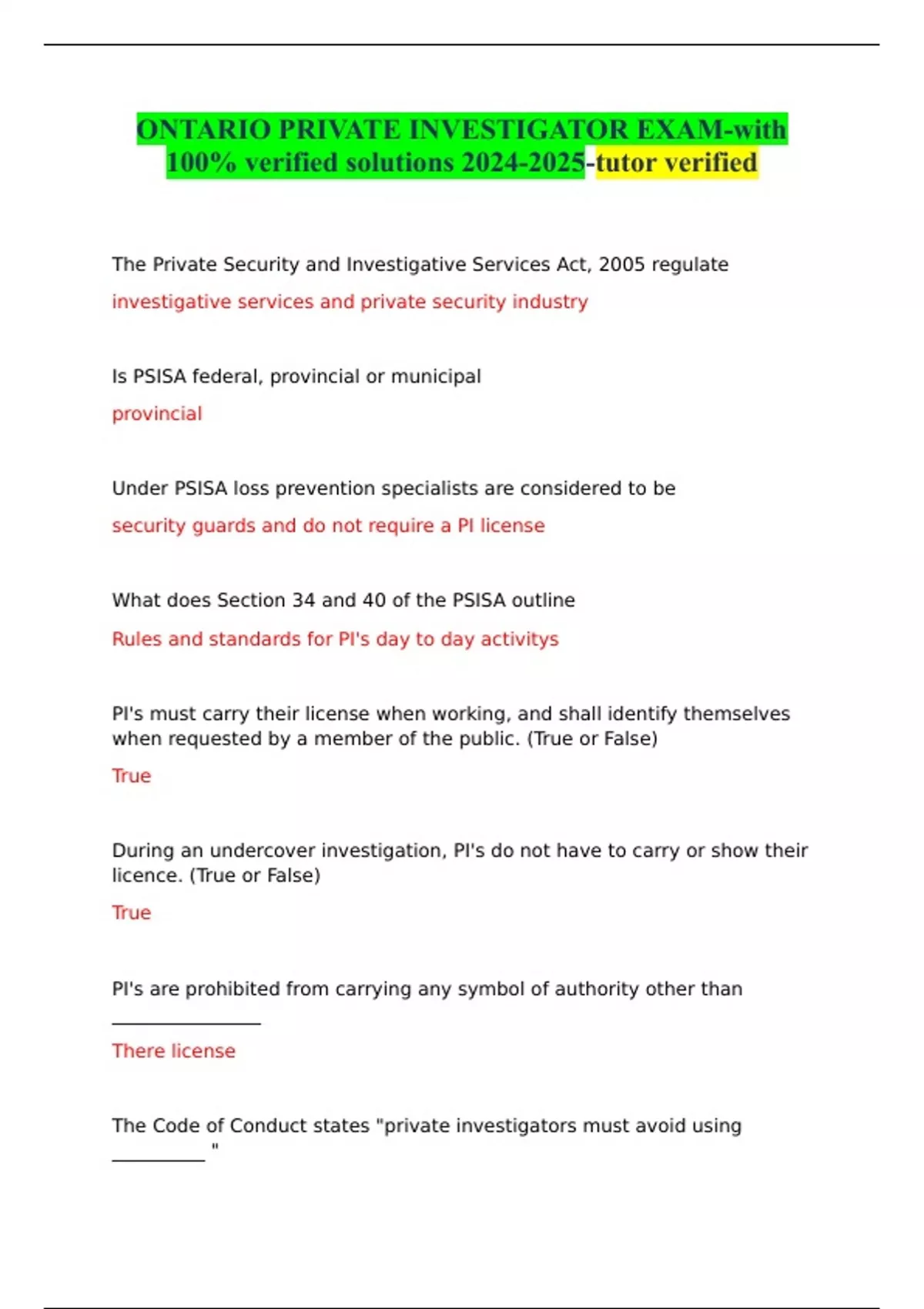 ONTARIO PRIVATE INVESTIGATOR EXAM-with 100% verified solutions -tutor verified