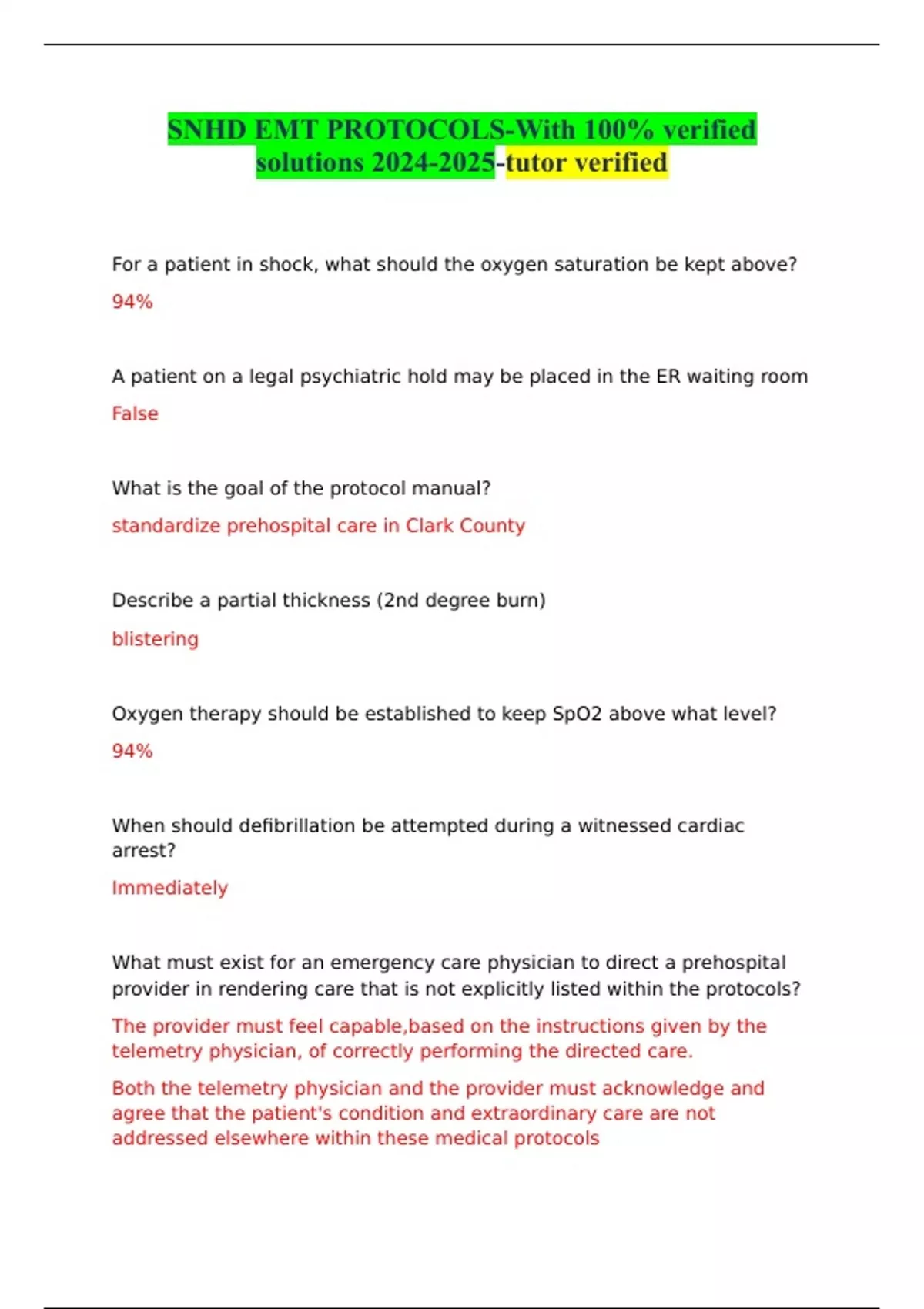 SNHD EMT PROTOCOLS-With 100% verified solutions -tutor verified