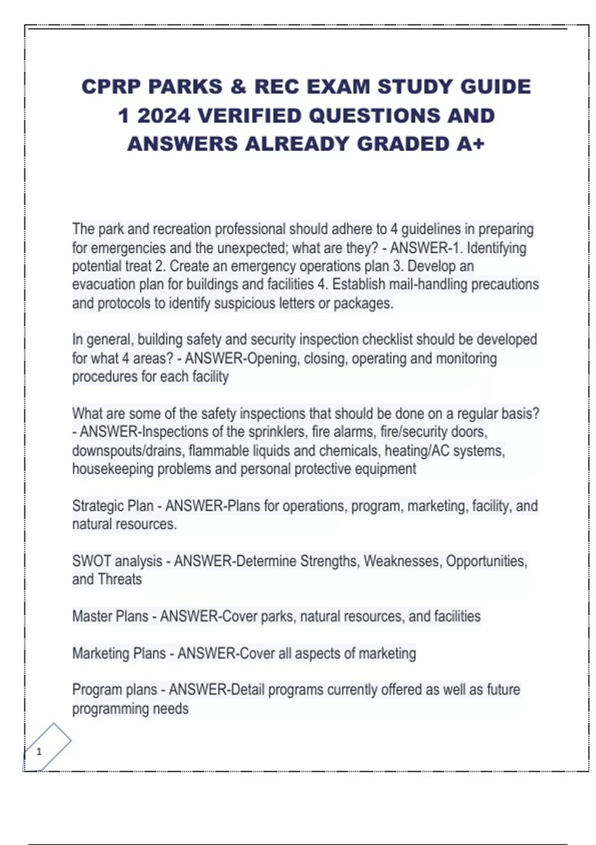 CPRP PARKS & REC EXAM STUDY GUIDE 1 2024 VERIFIED QUESTIONS AND ANSWERS ALREADY GRADED A+