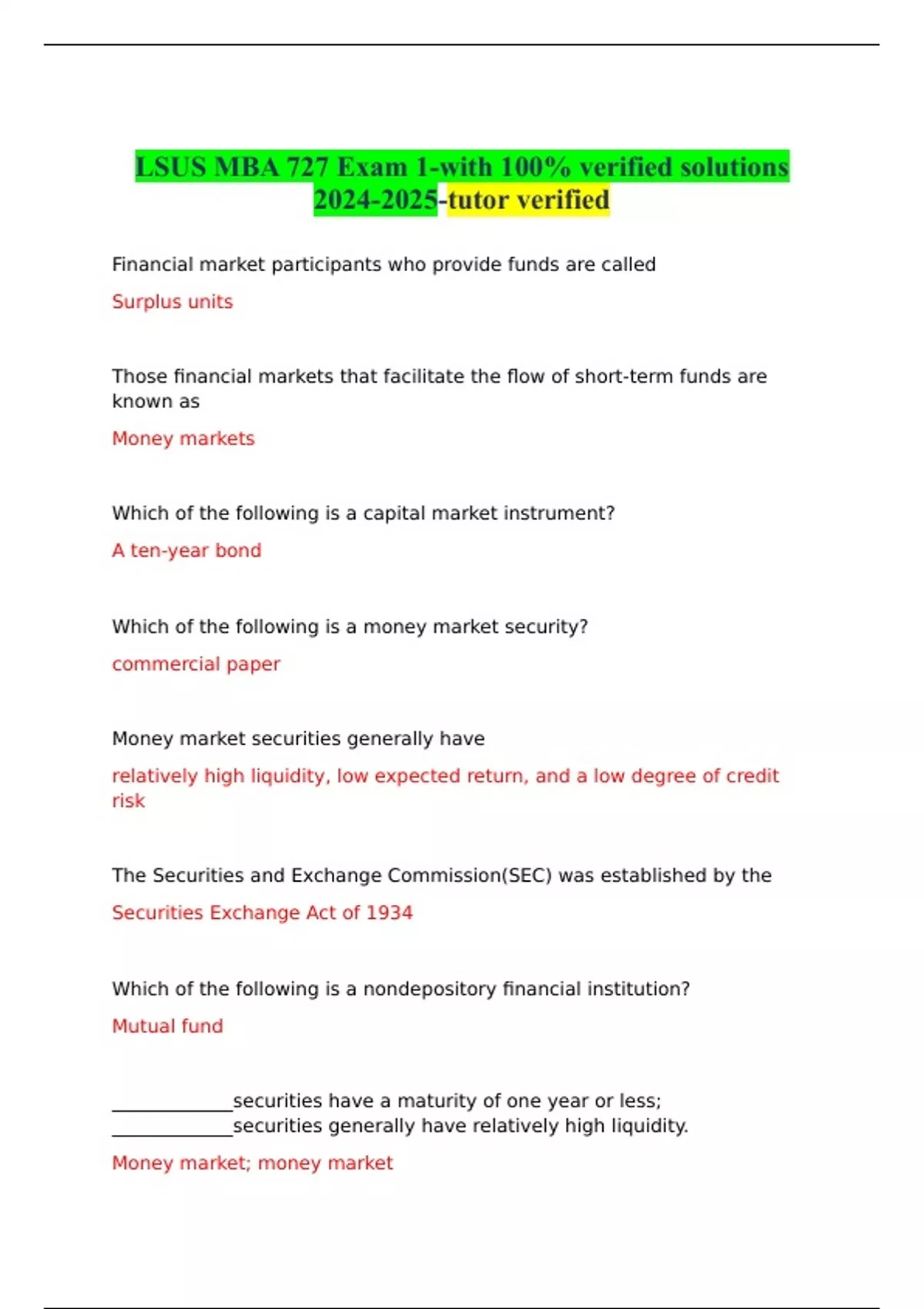 LSUS MBA 727 Exam 1-with 100% verified solutions -tutor verified