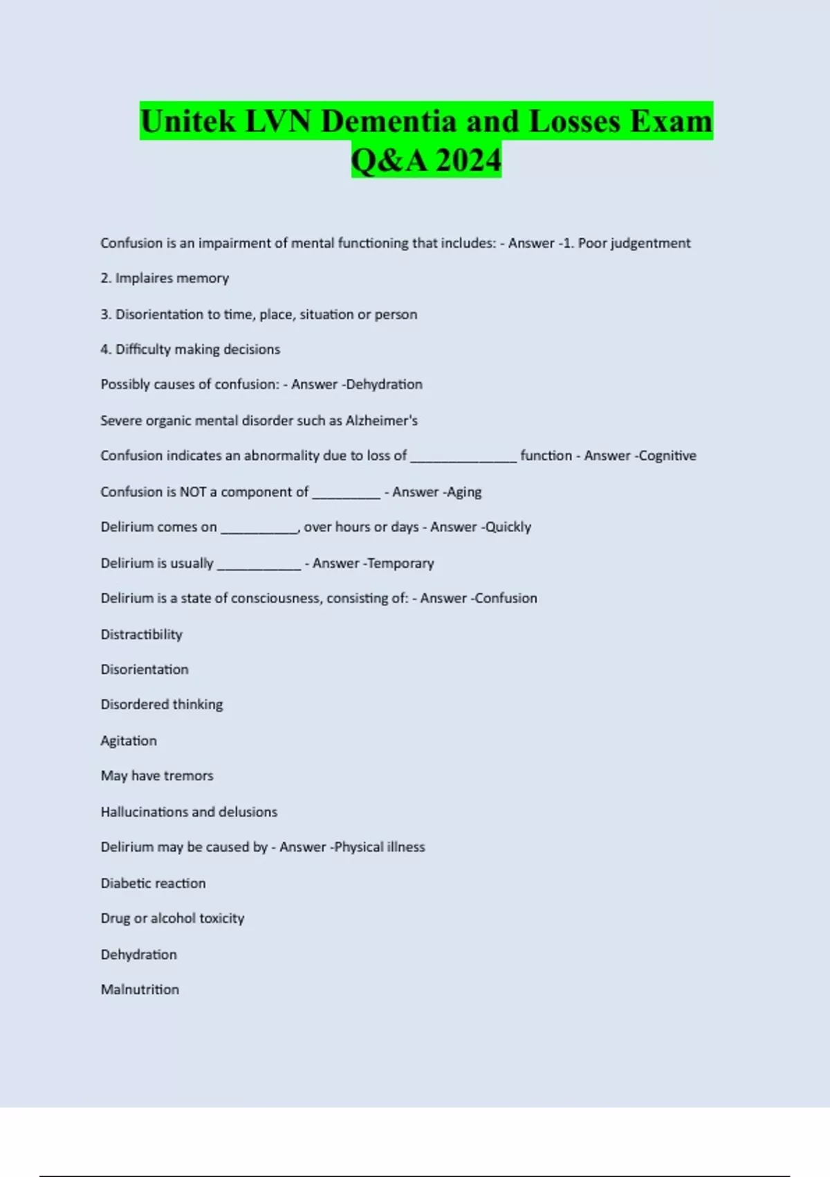 Unitek LVN Dementia and Losses Exam Q&A 2024 Confusion is an impairment of mental functioning that includes: - Answer -1. Poor judgentment 2. Implaires memory 3. Disorientation to time, place, situation or person 4. Difficulty making decisions Possibly causes of confusion: - Answer -Dehydration Severe organic mental disorder such as Alzheimer's Confusion indicates an abnormality due to loss of ______________ function - Answer -Cognitive Confusion is NOT a component of _________ - Answer -Aging Delirium comes on __________, over hours or days - Answer -Quickly Delirium is usually ___________ - Answer -Temporary Delirium is a state of consciousness, consisting of: - Answer -Confusion Distractibility Disorientation Disordered thinking Agitation May have tremors Hallucinations and delusions Delirium may be caused by - Answer -Physical illness Diabetic reaction Drug or alcohol toxicity Dehydration MalnutritionHead trauma Sensory infection Systemic infection Electrolyte imbalance