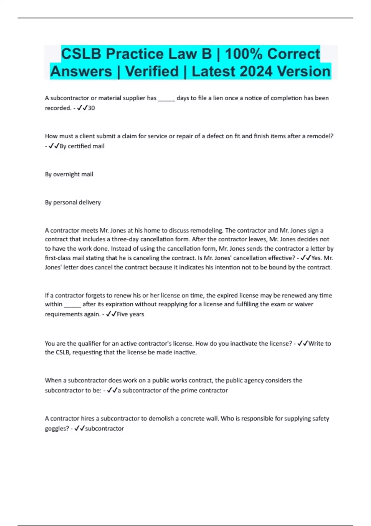 CSLB Practice Law B | 100% Correct Answers | Verified | Latest 2024 Version A subcontractor or material supplier has _____ days to file a lien once a notice of completion has been recorded. - 30 How must a client submit a claim for service or repair of a defect on fit and finish items after a remodel? - By certified mail By overnight mail By personal delivery A contractor meets Mr. Jones at his home to discuss remodeling. The contractor and Mr. Jones sign a contract that includes a three-day cancellation form. After the contractor leaves, Mr. Jones decides not to have the work done. Instead of using the cancellation form, Mr. Jones sends the contractor a letter by first-class mail stating that he is canceling the contract. Is Mr. Jones' cancellation effective? - Yes. Mr. Jones' letter does cancel the contract because it indicates his intention not to be bound by the contract. If a contractor forgets to renew his or her license on time, the expired license may be renewed any time within _____ after its expiration without reapplying for a license and fulfilling the exam or waiver requirements again. - Five years You are the qualifier for an active contractor's license. How do you inactivate the license? - Write to the CSLB, requesting that the license be made inactive. When a subcontractor does work on a public works contract, the public agency considers the subcontractor to be: - a subcontractor of the prime contractor A contractor hires a subcontractor to demolish a concrete wall. Who is responsible for supplying safety goggles? - subcontractor Sometimes contracts prove to be too vague to interpret without disagreement between owner and contractor. Which of the following steps would best prevent such problems? - Review the plans and specifications with the owner. A contractor is looking for an insurance policy to cover a high degree of exposure to risk. Of the following, which policy would be best for this purpose? - umbrella To whom do you report and pay sales tax? - Board of Equalization The federal Employer Identification Number (EIN) is issued by the: - Internal Revenue Service When purchasing insurance, what is the best way to choose among different companies? - cost and coverage As required by the Immigration Reform and Control Act, all employees hired on or after November 7, 1986 must complete Form _____ to verify their employment eligibility status. - I-9 If required safety devices are missing from tools, what should an employee do? - Notify the contractor, who is responsible for safety. Of the following, which document is usually delivered first in a transaction involving a home improvement contract? - "Notice to Owner" Who is ultimately responsible for seeing that safety equipment is actually put to use on the jobsite? - contractor A mechanics' lien is a written document that must be signed and verified by the claimant. The first and third steps a contractor should take in filing a lien are listed below. Step 1: Obtain the exact legal description of the property. Step 2: Step 3: Find out if the person requesting the work of improvement is the owner. What is Step 2? - Find out the name of the legal owner of the property as well as the percent of ownership. A(n) _____ represents a company's financial position on a specified date. - balance sheet When you get an approved set of plans, what should you do first? - Read any notes from the building department. When bidding on work, which of the following would you NOT include in the price of your bid? - worker's compensation insurance premium The purpose of a "Preliminary 20-day Notice" for private work is to: - notify the property owner that the subcontractor or firm who sent the notice will be making improvements on the property When should you let your attorney see a construction contract? - After the contract is prepared, but before you sign it. When is an employee allowed to view their own personnel file? - whenever they wish to Before beginning work, an employer or contractor must inquire whether asbestos is present in any building constructed prior to: - 1978 Is it legal for a contractor to require employees to take lie detector tests? - It is not legal for the contractor to require lie detector tests, but it would be legal for a federal, state, or local public agency to require lie detector tests of their employees. When is the last day a customer can cancel a contract